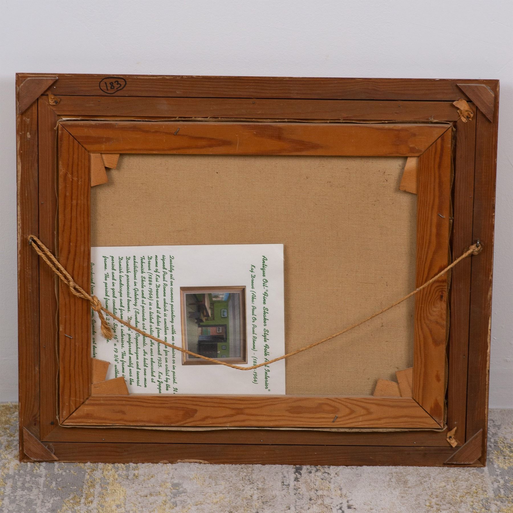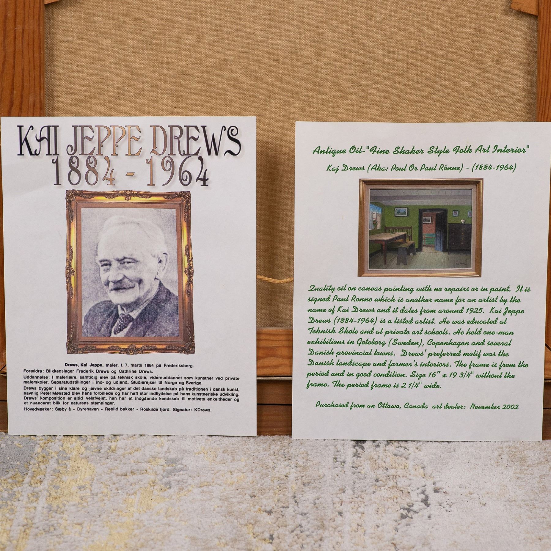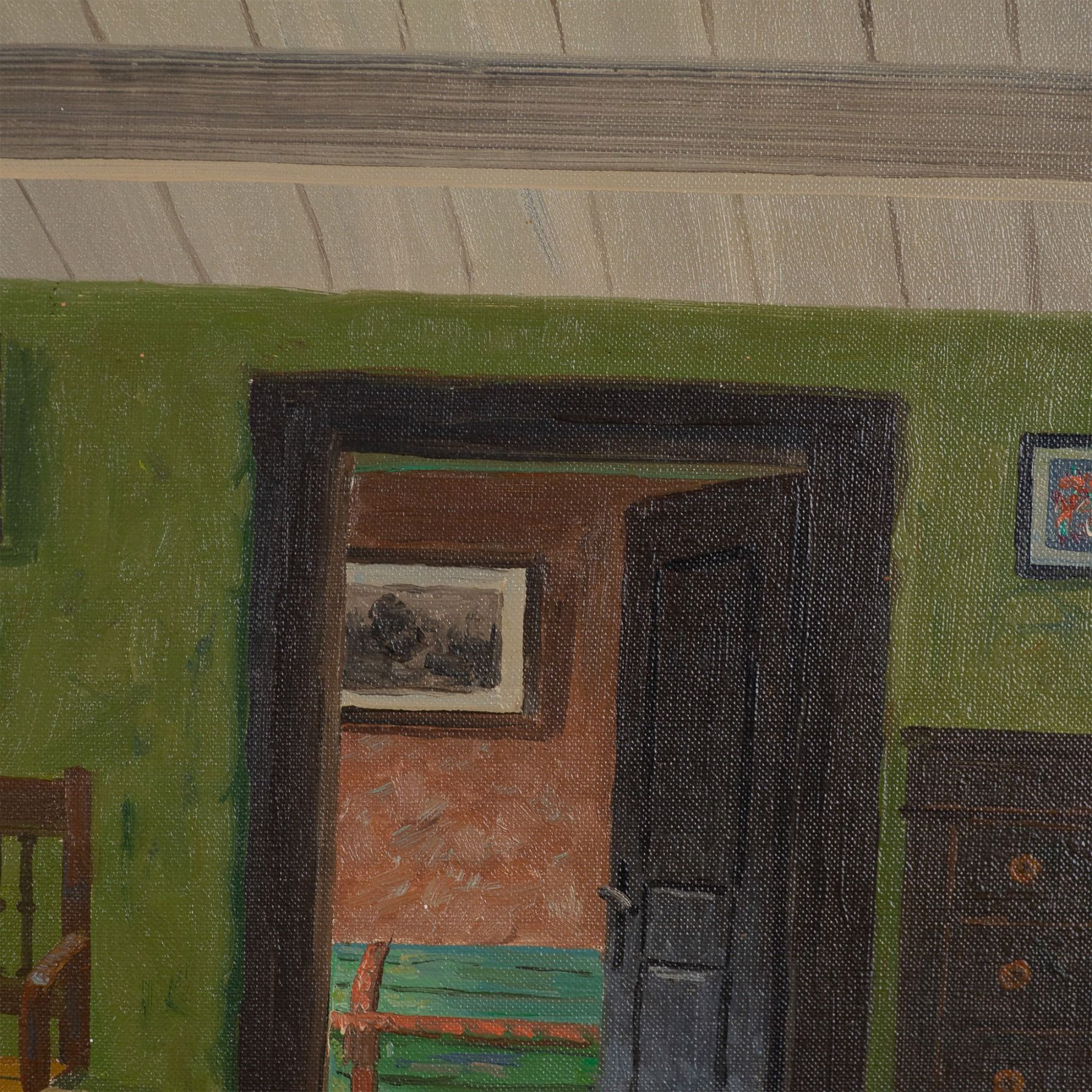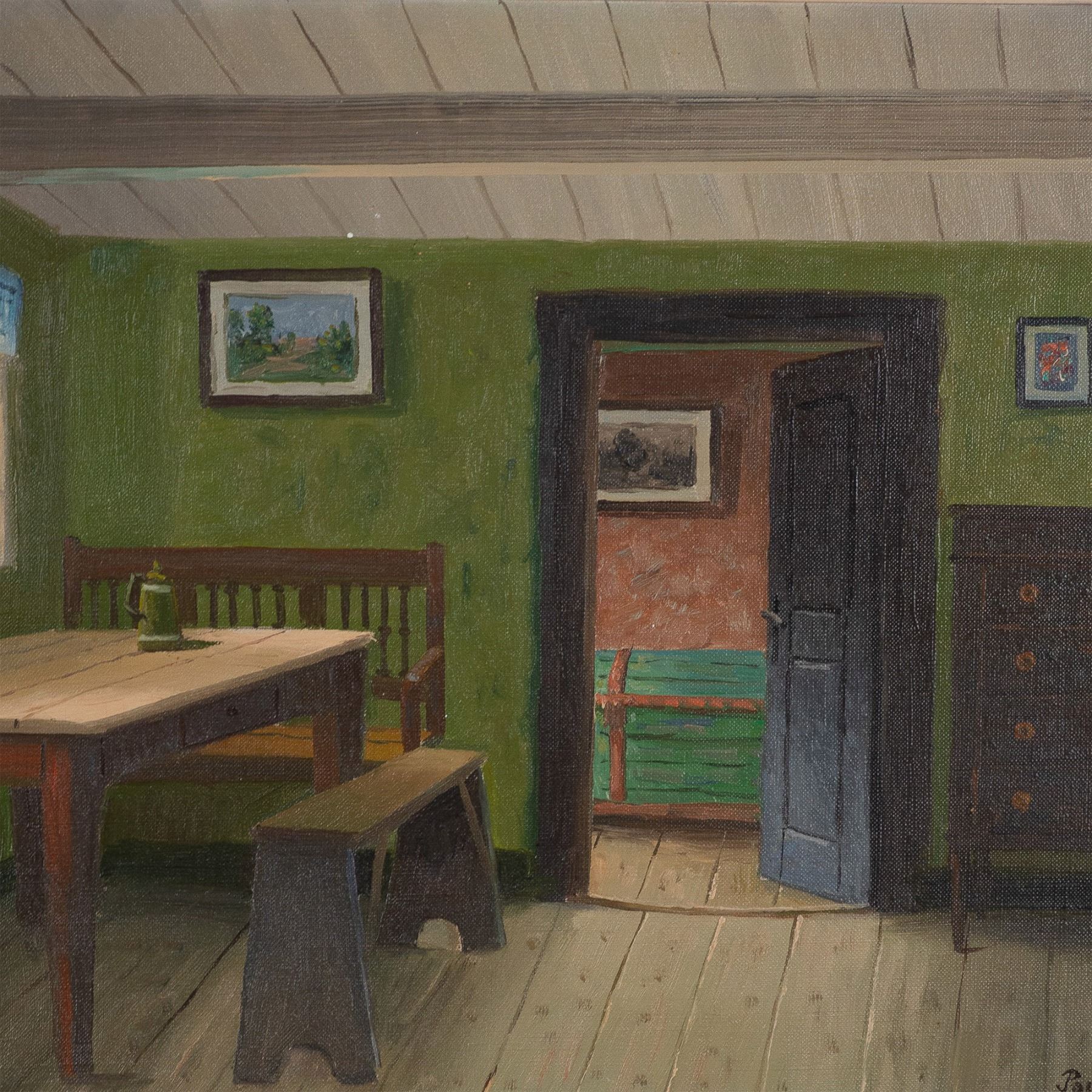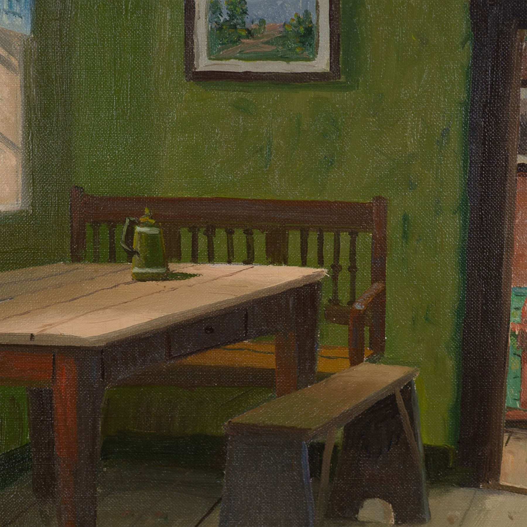 This oil on canvas painting, signed by Paul Ronne, a pseudonym for Danish artist Kai Jeppe Drews, depicts a tranquil Scandinavian interior. The composition highlights a wooden dining table paired with a bench, set against a soft green wall adorned with framed artwork. The light streams through a window, illuminating the cozy space and casting gentle shadows that add depth to the room. A rustic chest of drawers and an open doorway revealing another room enhance the sense of intimacy and warmth. The artist's delicate use of color and precise brushwork emphasize the charm and simplicity of rural life, celebrating the Scandinavian design aesthetic that values functionality and natural beauty. The green tones of the walls harmonize with the muted wood textures, creating a serene and inviting atmosphere. This work exudes the timeless appeal of domestic tranquility and would be a delightful addition to any art collection. Kai Jeppe Drews, was a Danish painter recognized for his evocative portrayals of rural and domestic scenes. His works often focused on capturing the serene beauty of Scandinavian landscapes and interiors, emphasizing the interplay of light and texture. Drews' ability to evoke emotion through simple, everyday moments has earned him a place among celebrated Scandinavian artists. Housed in a gilded frame. Signature on lower right: Paul Ronne. Artwork dimensions: 19.50"L x 15.50"H. Frame dimensions: 24.25"L x 20.25"H x 2"W.