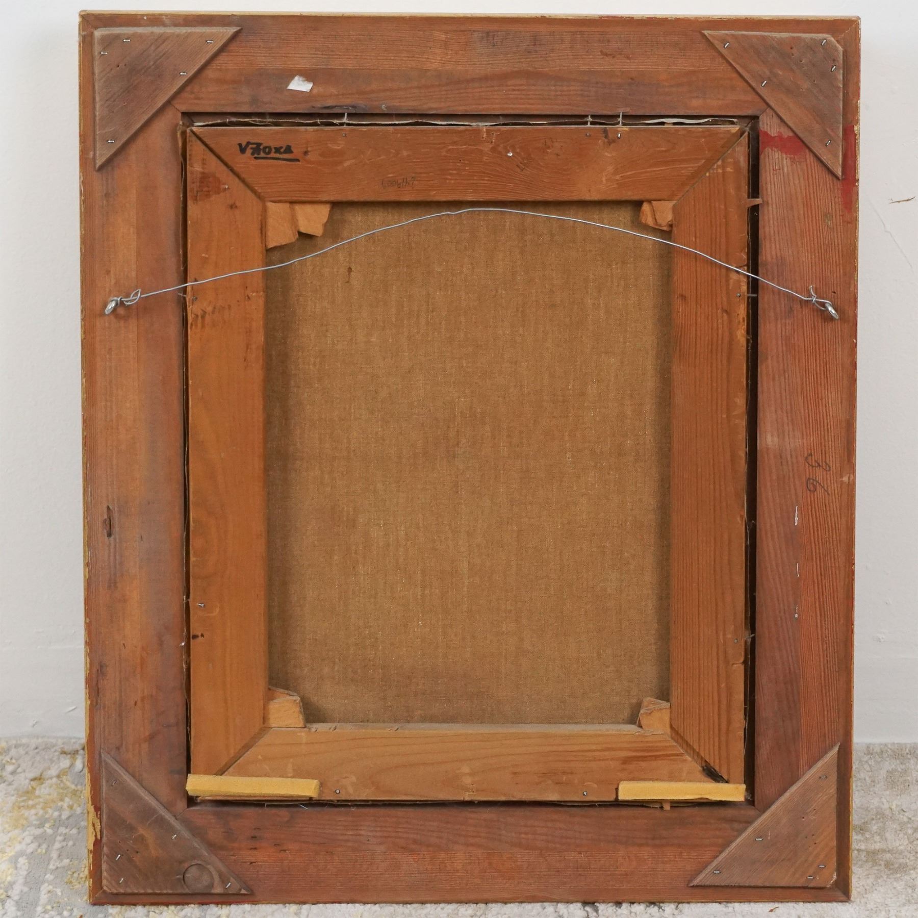 This refined interior scene by Paul Ronne, also known as Kai Jeppe Drews, captures the elegance and tranquility of Scandinavian design. The painting features a meticulously arranged interior with a tall, graceful longcase clock, a round table adorned with a simple vase of roses, and a crimson-upholstered chair. Soft light filters through an unseen window, creating a harmonious interplay of shadow and reflection that emphasizes the quiet elegance of the space. The restrained color palette of muted whites, warm golds, and deep reds highlights the simplicity and sophistication of Scandinavian interiors. The artist's careful attention to perspective and detail imbues the painting with a sense of depth and realism, drawing the viewer into this serene and contemplative environment. Danish artist Kai Jeppe Drews, was celebrated for his depictions of Scandinavian interiors and rural landscapes. Born and raised in Denmark, Drews was deeply inspired by the understated beauty and functionality of Danish design. His works often explored themes of domestic tranquility and the intimate relationship between space and light. By adopting the pseudonym Paul Ronne, Drews expanded his creative expression and catered to diverse audiences while maintaining a signature style characterized by precision and an emotive sense of place. Housed in a gilded frame. Signature on lower right: Paul Ronne. Artwork dimensions: 12"L x 15"H. Frame dimensions: 17.50"L x 20.50"H x 2.50"W.