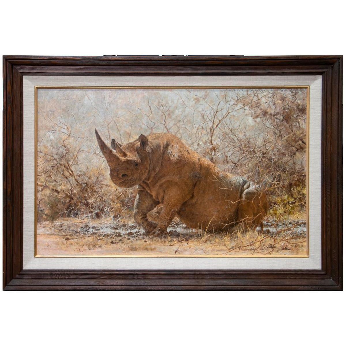 Paul Rose (Born 1931). Title:Black Rhino Rising, oil on canvas. Sight 34in. h 51in. w. Frame: 39 1/2in. h. 57 1/2in. w. Note: large item to ship.