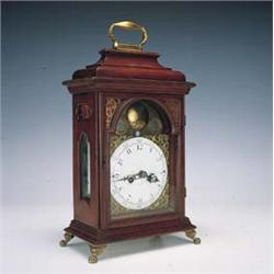 Paul Russ, Mieva. Reloj de sobremesa neoclásico. Trabajo báltico, último cuarto S. XVIII. Medidas: 40 x 14 x 24 cms. Caja de caoba y bronce. Esfera de esmalte blanco decorado en púrpura. La esfera muestra péndulo subsidiario montado con strass.
