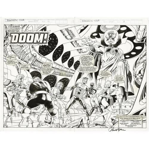 <B>Paul Ryan and Danny Bulanadi - Fantastic Four #375, Splash Page 2 and 3 Original Art (Marvel, 1993).</B></I> Behold the cosmic digs of Uatu -- the Watcher. The Thing, the Human Torch, Mr. Fantastic, and the Invisible Woman are about to find out that "It's always darkest before the doom." The combined image area of these pages measures 21" x 15", and aside from some yellowing pasted-on lettering, the art is in Very Good condition.<BR><BR><b>Shipping:</b> Small Flat (<a target="_blank" href="http://www.heritageauctions.com/common/shipping.php">view shipping information</a>)
