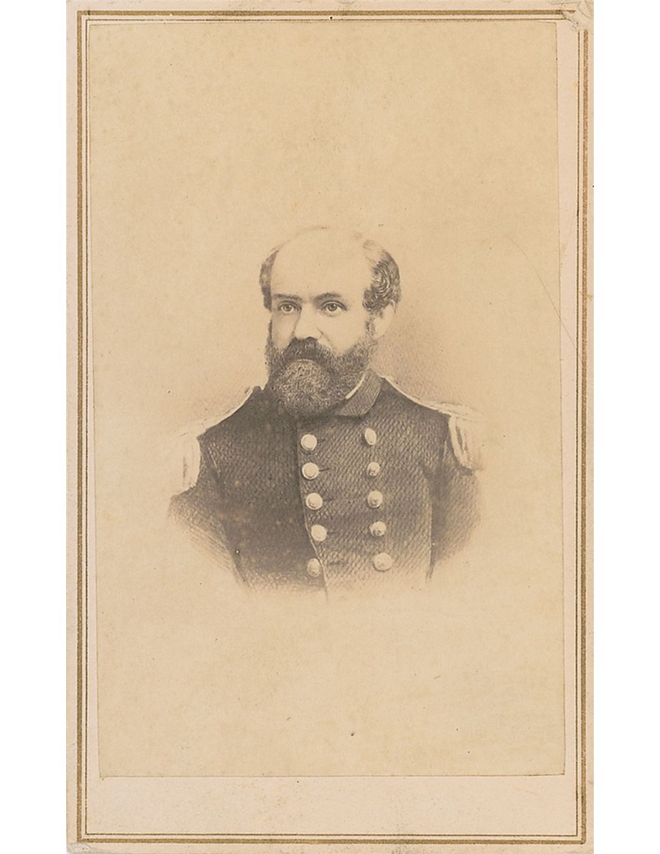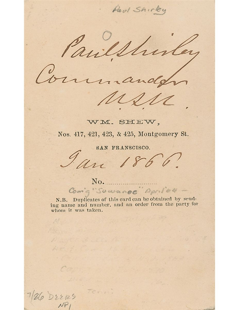 Union commander who served on board the Cyane, Paul Jones, and Suwanee. Original 2.25 x 4 carte-de-visite bust photo by William Shew of San Francisco, signed on the reverse in black ink, “Paul Shirley, Commander U.S.N., Jan 1866.” In fine condition, with a few pencil notations and remnants to reverse and a couple dings to top edge.