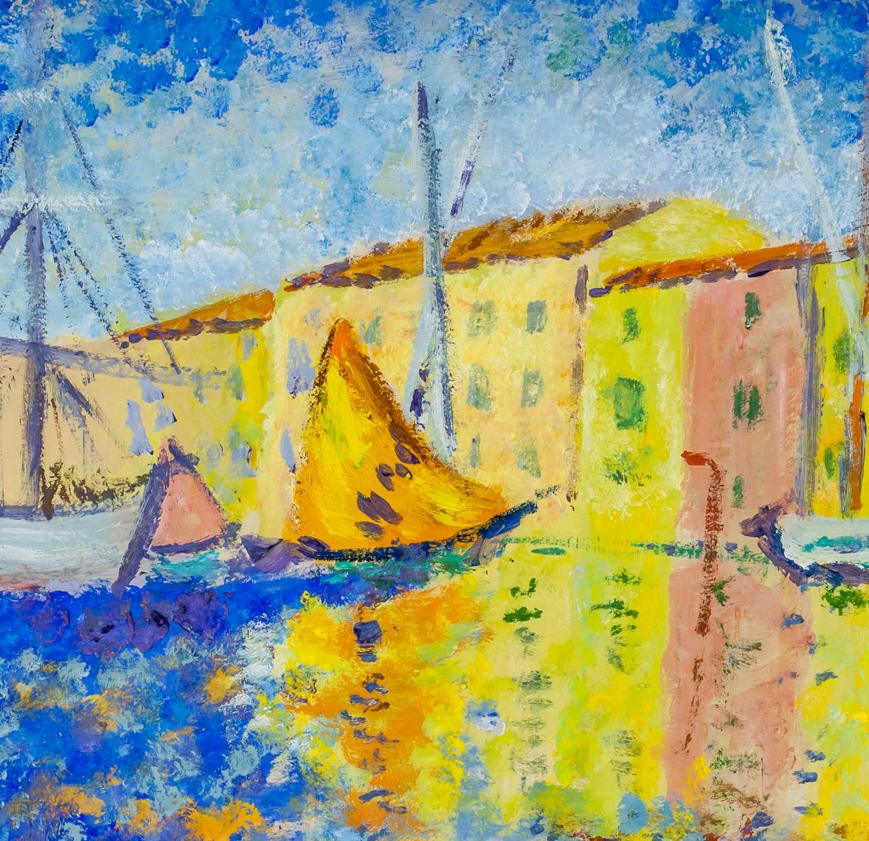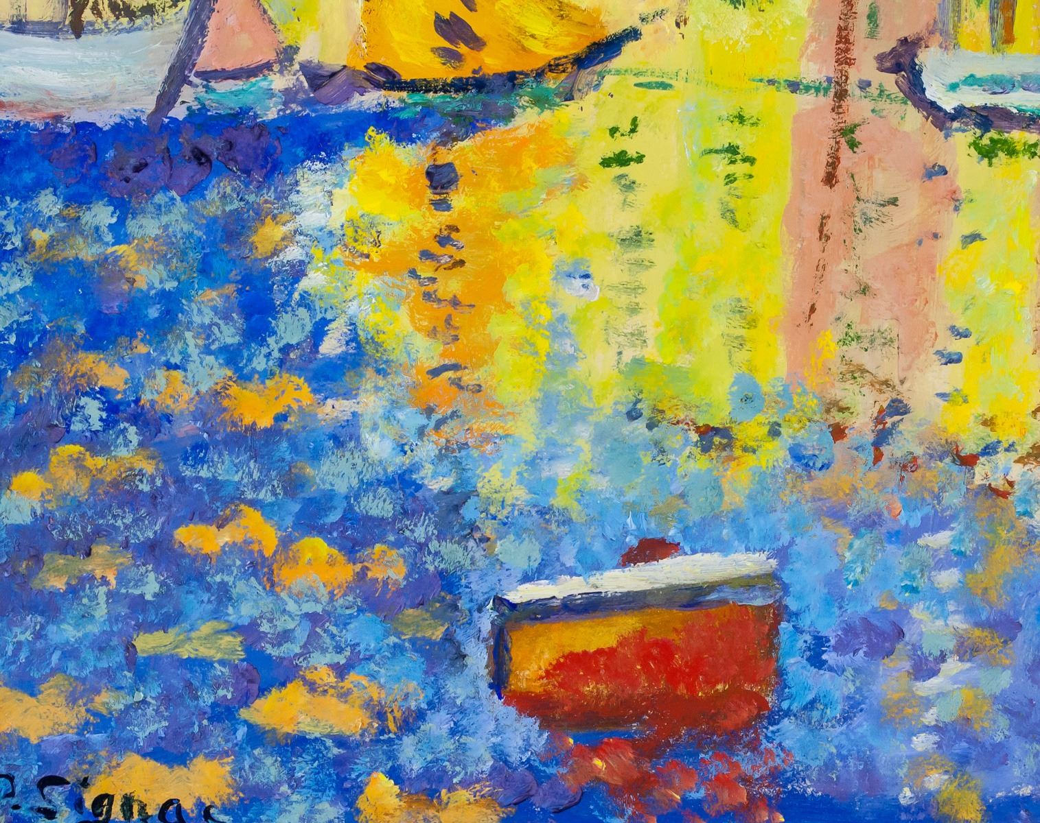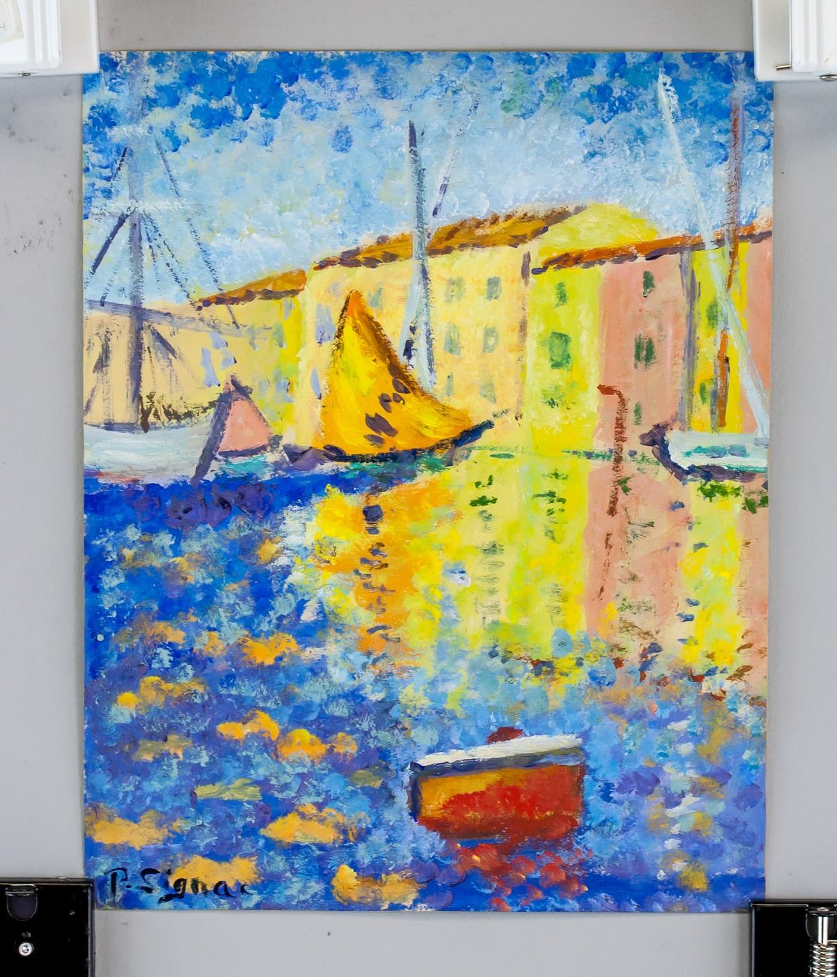 Oil on paper. Featuring a landscape scene. of the harbor. Signed P. Signac on the lower left corner. Stamped Salon d'Art and inscribed 16, verso. Inscribed 3 in pencil on the upper left corner, verso. Attributed to Paul Signac (1863-1935, French). 23 x 18.5 cm (9.25 x 7.25 in). PROVENANCE: Southern Ontario estate
