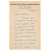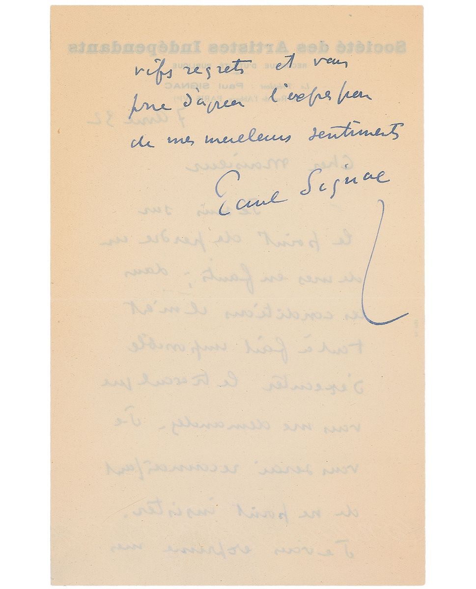 French neo-impressionist painter (1863–1935) who, working with Georges Seurat, helped develop the Pointillist style. ALS in French, one page both sides, 8.25 x 5.25, Societe des Artistes Independants letterhead, April 7, 1932. In part (translated): “I am about to lose one of my children; in these circumstances, I find it quite impossible to execute the work you ask of me. I'll be grateful to you not to insist.” In fine condition. Signac was among the founders of the Societe des Artistes Independants in 1884, an organization dedicated to holding large independent art exhibitions in Paris. The format departed from the traditional Salon in that it lacked awards and a selection jury, allowing artists to present their work to the public with complete artistic freedom.