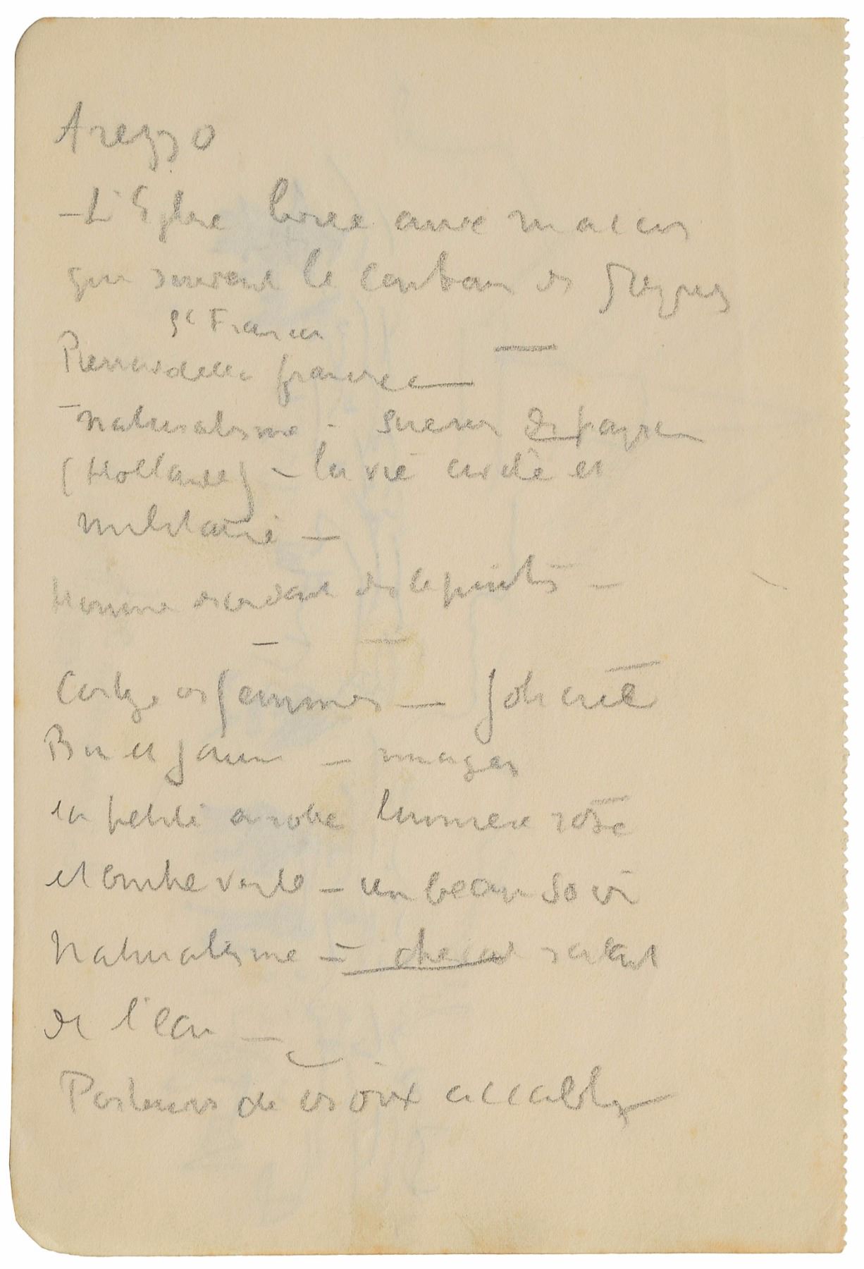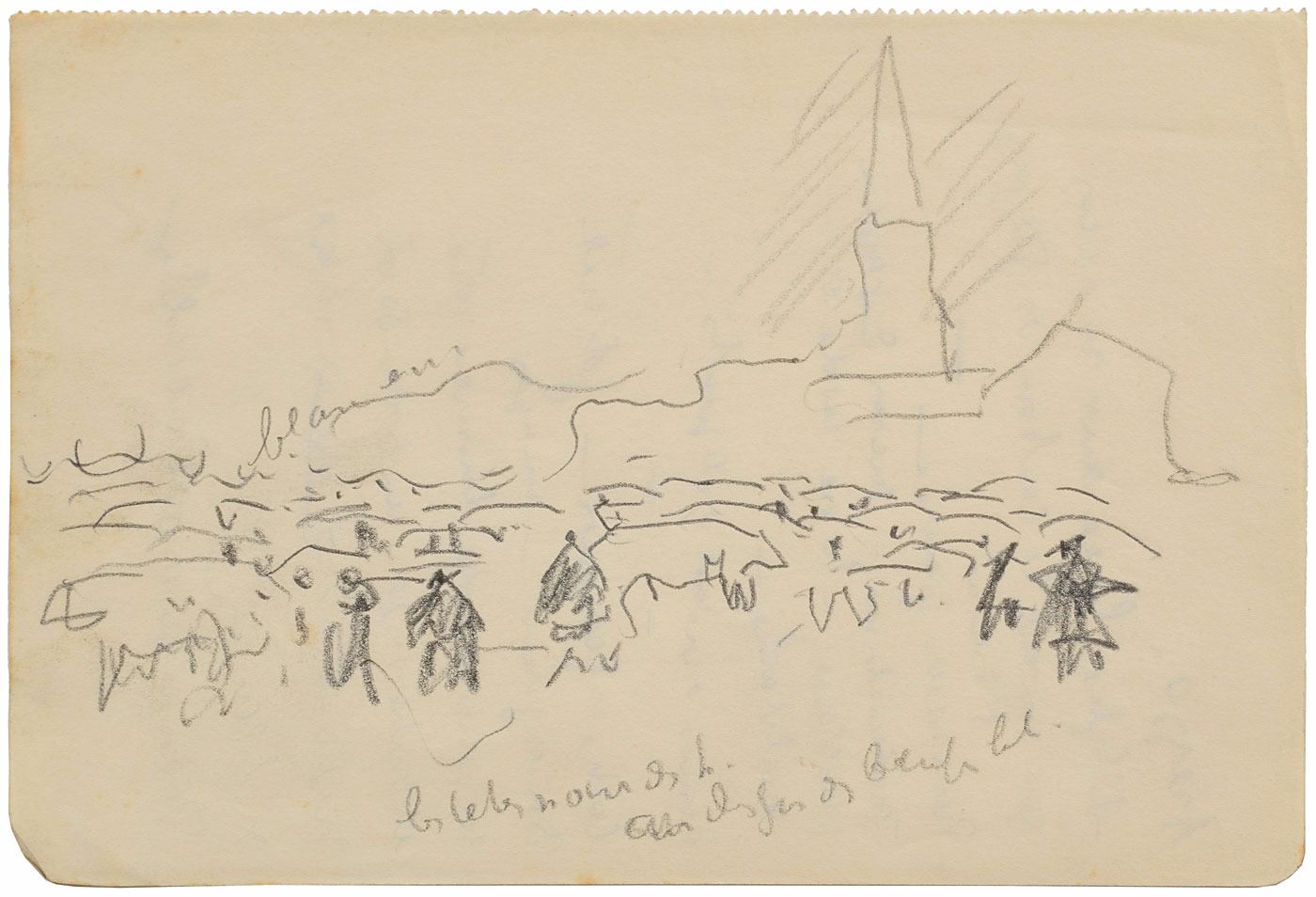 French neo-impressionist painter (1863–1935) who, working with Georges Seurat, helped develop the Pointillist style. Fabulous original pencil sketch of the landscape of Arezzo, Italy, with the famous Arezzo Cathedral dominating the skyline, accomplished by Signac on an off-white 7 x 4.75 album page; the reverse bears handwritten notes in French by the artist, headed "Arezzo." In fine condition.