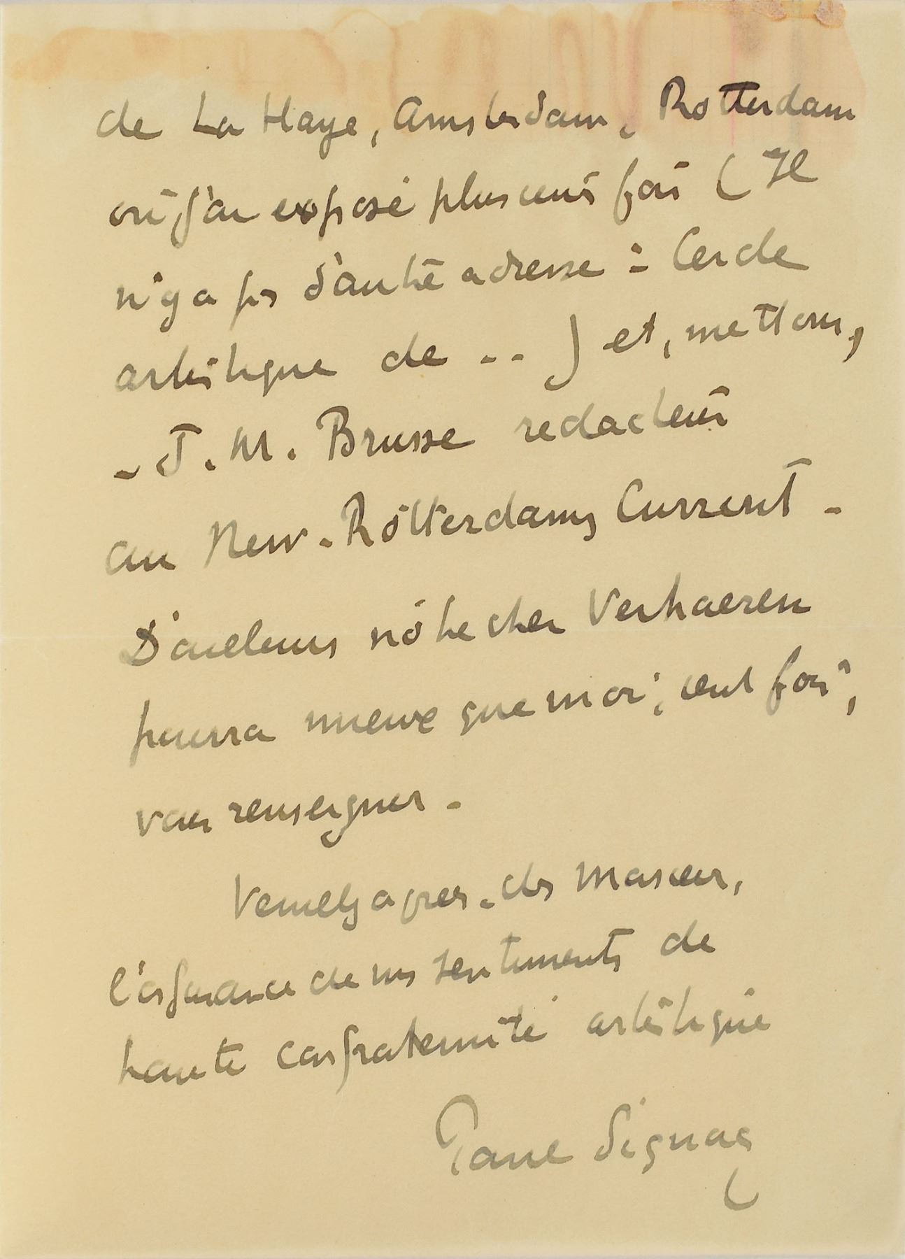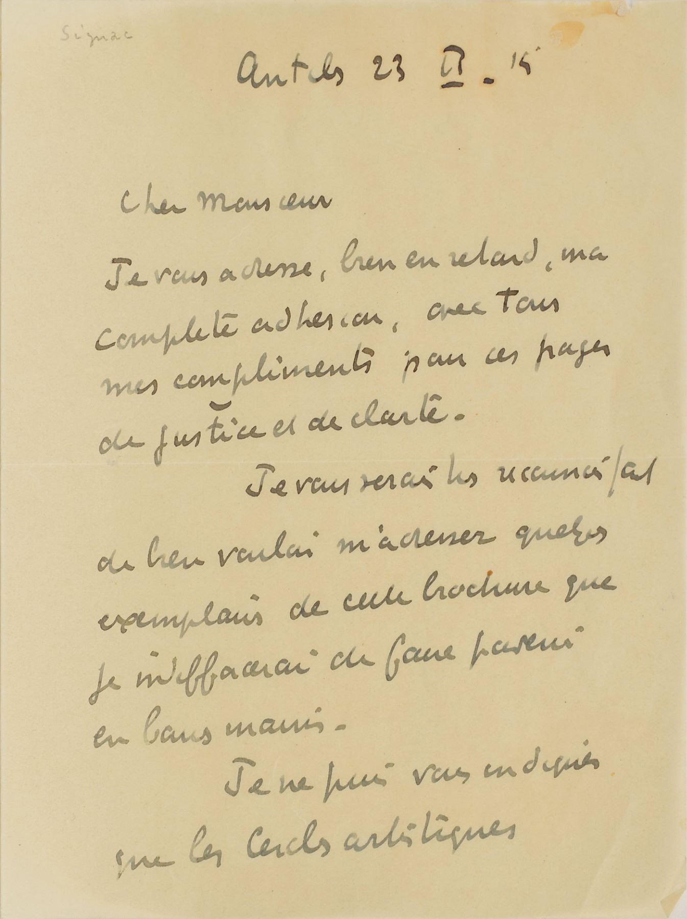 French neo-impressionist painter (1863–1935) who, working with Georges Seurat, helped develop the Pointillist style. Untranslated ALS in French, two pages, 5.25 x 7, February 23, 1915. In fine condition, with old mounting remnants along the reverse top edge.