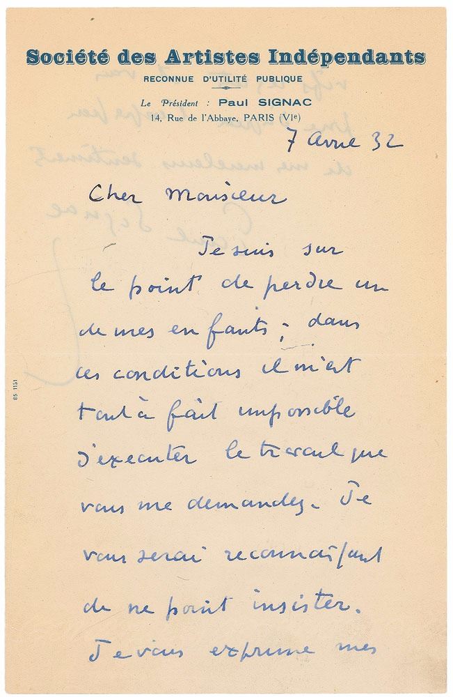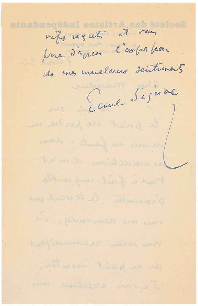 French neo-impressionist painter (1863–1935) who, working with Georges Seurat, helped develop the Pointillist style. ALS in French, one page both sides, 8.25 x 5.25, Societe des Artistes Independants letterhead, April 7, 1932. In part (translated): “I am about to lose one of my children; in these circumstances, I find it quite impossible to execute the work you ask of me. I'll be grateful to you not to insist.” In fine condition. Signac was among the founders of the Societe des Artistes Independants in 1884, an organization dedicated to holding large independent art exhibitions in Paris. The format departed from the traditional Salon in that it lacked awards and a selection jury, allowing artists to present their work to the public with complete artistic freedom.