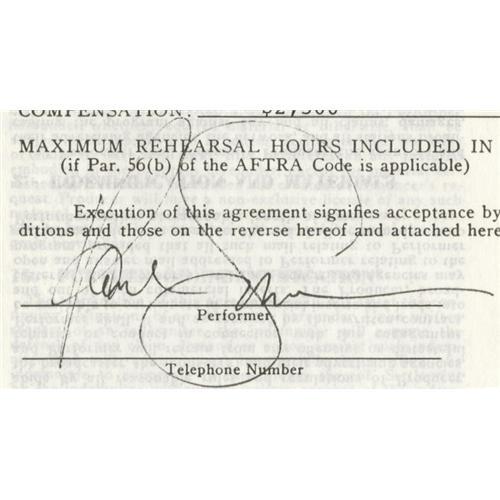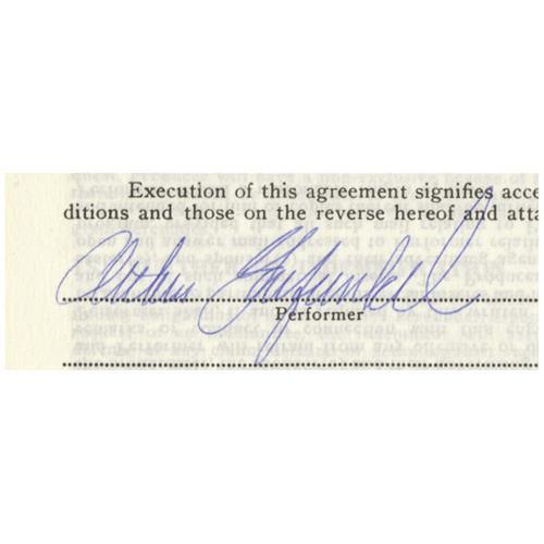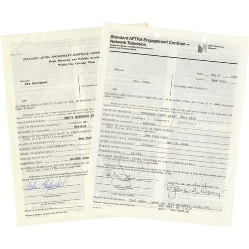 <B>Paul Simon and Art Garfunkel Signed "Saturday Night Live" Contracts.</B></I> Included is a standard AFTRA engagement contract dated March 3, 1978, engaging Art Garfunkel as host for an episode of <I>Saturday Night Live,</B></I> signed by him in blue ink; plus a second standard AFTRA contract dated May 9, 1986, engaging Paul Simon as co-host for an episode of the show, signed by him in black ink. Both are in Very Fine to Excellent condition with mild wear and tanning, and the usual staple and binder holes.<I>Accompanied by LOA from PSA/DNA.</B></I><BR><BR><b>Shipping:</b> Flat Material, Small (<a target="_blank" href="http://www.heritageauctions.com/common/shipping.php">view shipping information</a>)