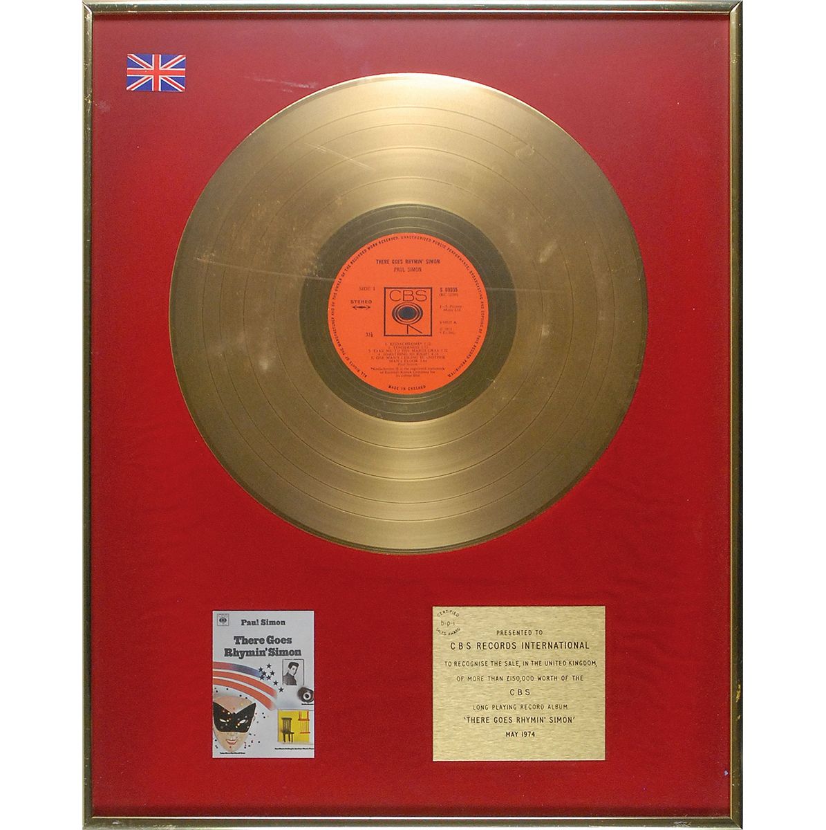 Official BPI gold record sales award presented “to CBS Records International to recognise the sale, in the United Kingdom, of more than £150,000 worth of the CBS long playing record album ‘There Goes Rhymin’ Simon’ May 1974.” Disc is framed with its plaque and a small color reproduction of the album cover to an overall size of 16.25 x 20.5. In fine condition.
