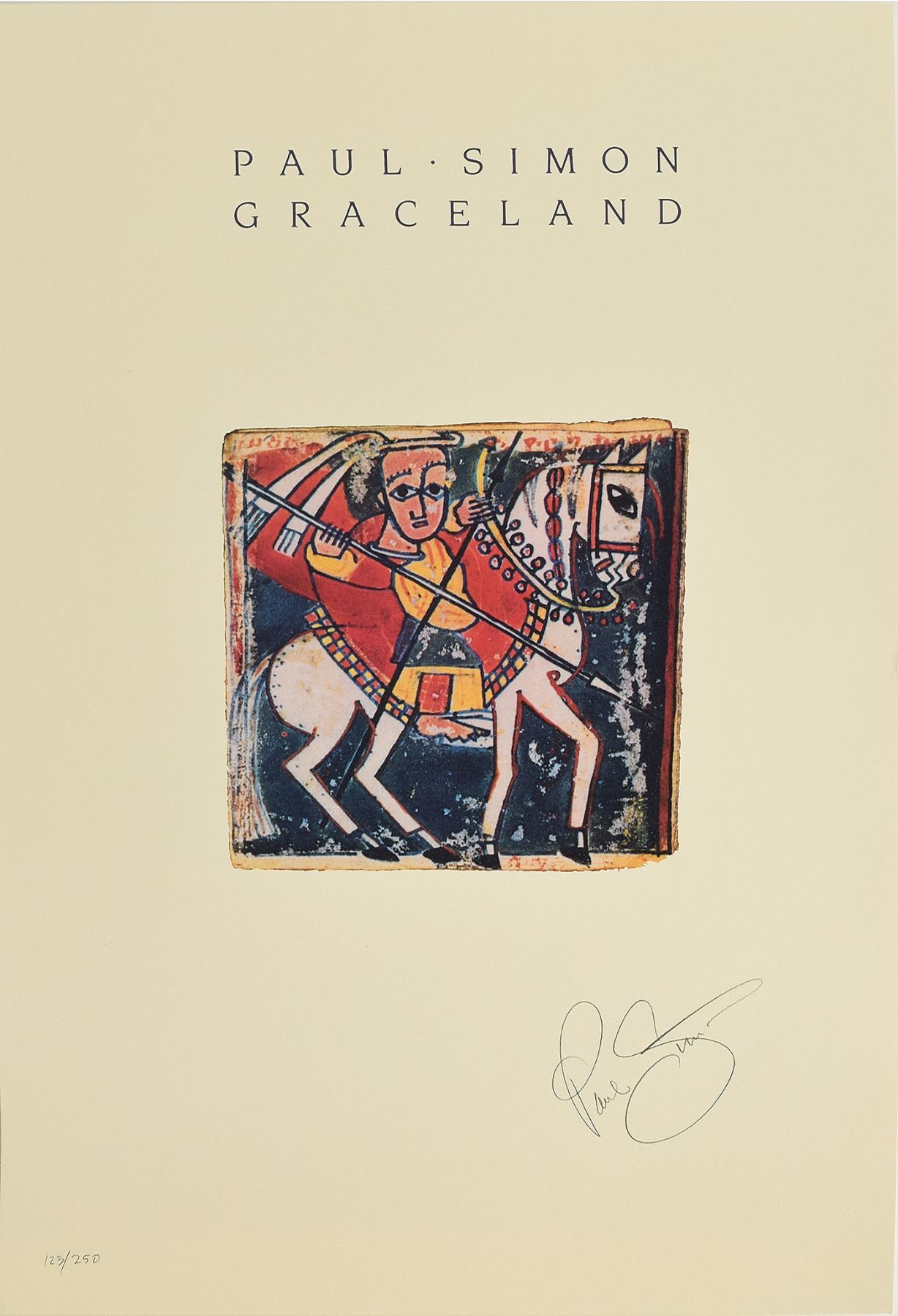Limited edition color 17 x 26 print showing the front cover for Paul Simon's seventh solo studio album, Graceland, numbered 123/250, signed in pencil by Simon. In fine condition.