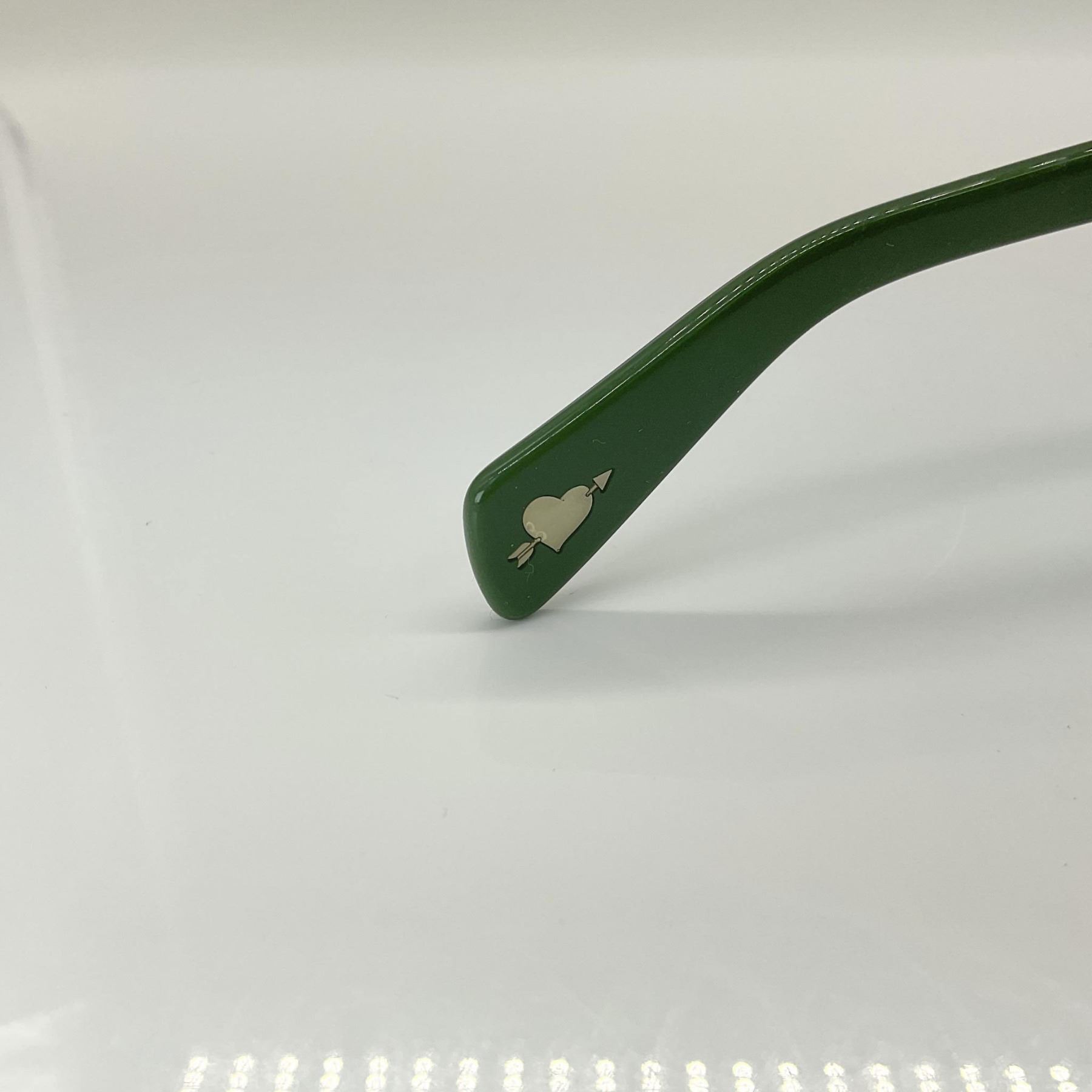 These stylish sunglasses feature a slight cat-eye design with a two-tone frame brown on the exterior and green on the interior. The look is completed with brown gradient lenses, blending elegance with a touch of modern flair. Frame size: 52/19/140. Glasses dimensions: 5.25"L x 2"H. This item has its original case: 6.25"L x 2.5"W x 2"H. Dimensions: See Description