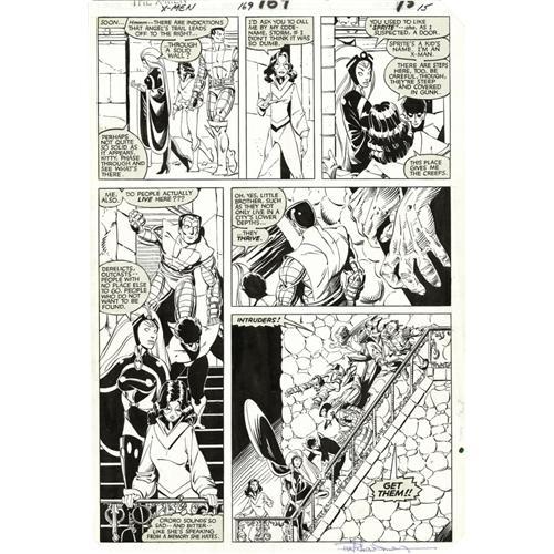 <B>Paul Smith and Bob Wiacek - The Uncanny X-Men #169, page 15 Original Art (Marvel, 1983).</B></I> Storm, Nightcrawler, Kitty, and Colossus descend into the New York City underground and tussle with a band of Morlocks in this "X-ceptional" page from the story, "Catacombs," written by X-Men scribe Chris Claremont. The image area measures 10" x 15", and the condition is Excellent. Signed by Paul Smith at the lower right. <BR><BR><B>Important notice:</B> Heritage usually auctions material at the rate of 200-250 lots per hour. On some occasions eBay Live bid software or the Internet may not be able to keep up with the pace of the auction. We recommend placing a realistic absentee bid now as insurance to avoid disappointment. Occasionally the auctioneer may eliminate or reject an eBay Live bid, and the auctioneer may also reopen a lot after the close of the eBay live bidding (usually because we missed an audience bid), and may reject your bid even if it shows you as the winning bidder. By bidding via eBay Live, you agree that Heritage may award the lot to another bidder at its sole discretion under the circumstances described above or any other reasonable circumstances. Since eBay bids are not shown to us until we open the lot on the floor, we treat those bids just like floor bids. In most cases the floor responds before the eBay bid is presented to us, due to Internet lag time, so for consistency we have made it a policy that floor bids are always considered first over tie eBay live bids. Also please note that all Heritage lots purchased through eBay Live carry a 22.5% Buyer's Premium. Please make sure you read the Terms and Conditions before you bid. This lot is being auctioned in conjunction with a live floor auction by Heritage Auction Galleries. All final auction and invoice information will be supplied by Heritage Auction Galleries, and all other information should be considered preliminary. Lot:41001 <BR><BR><B>Winning Notification and Billing:</B> After the FINAL session in this auction is complete, Heritage will send e-mail and snail mail invoices. This process normally takes several days. All final auction and invoice information will be supplied by Heritage Auction Galleries, and all other information should be considered preliminary. <BR><BR>This auction will be conducted on a live auction floor and over the Internet through eBay Live. If you choose to place an absentee bid, please take a moment to <font color='#0000ff'><u><a href='http://pages.ebay.com/liveauctions/help/before/laabsentee.html'>learn how eBay Live absentee bidding works</a></u></font><font color='#000000'>