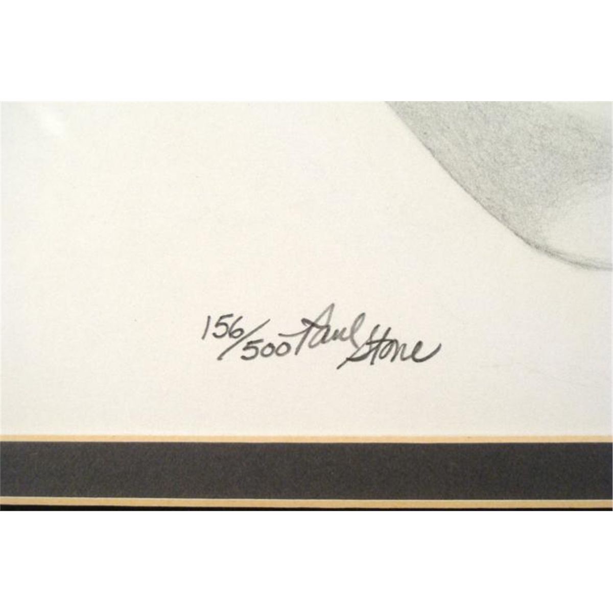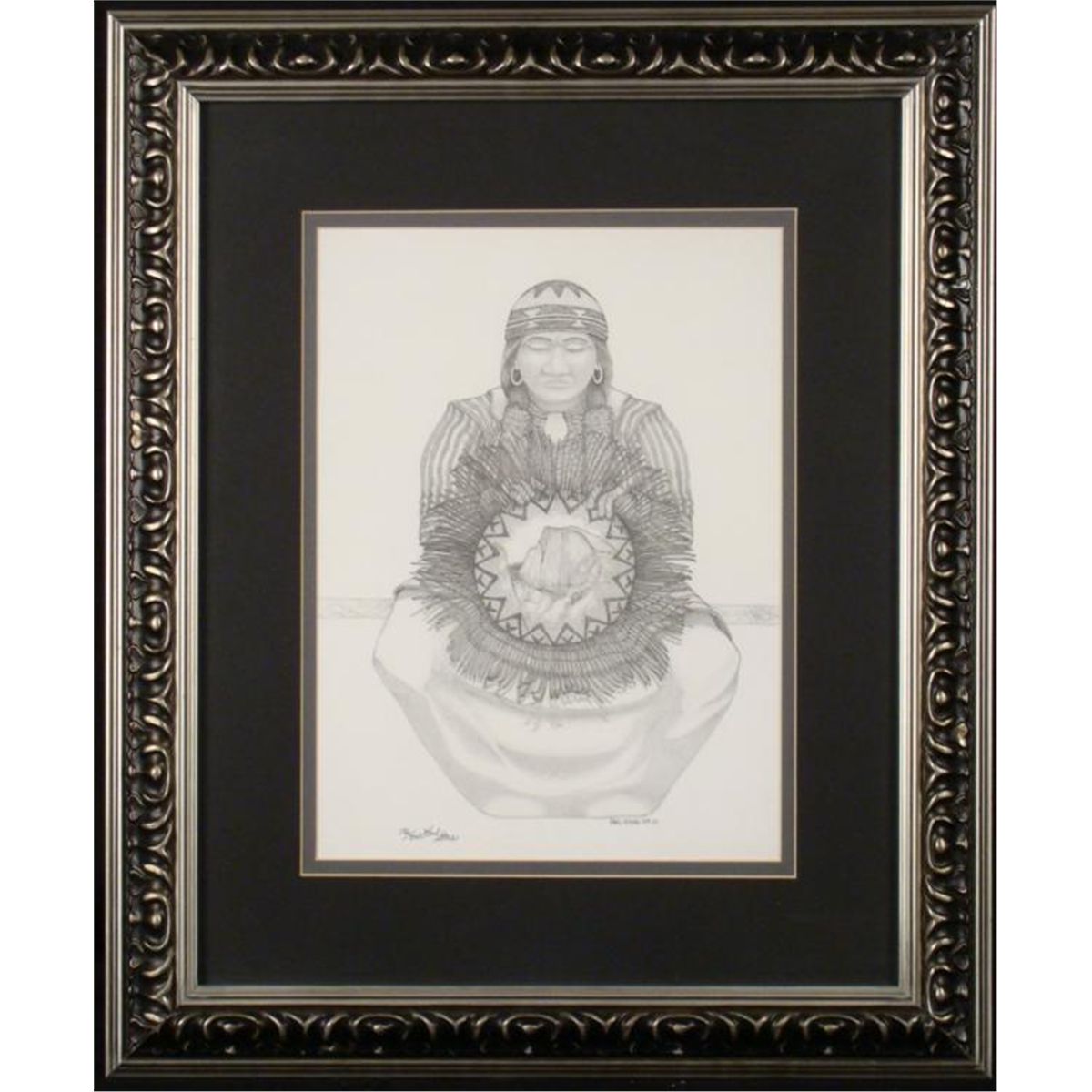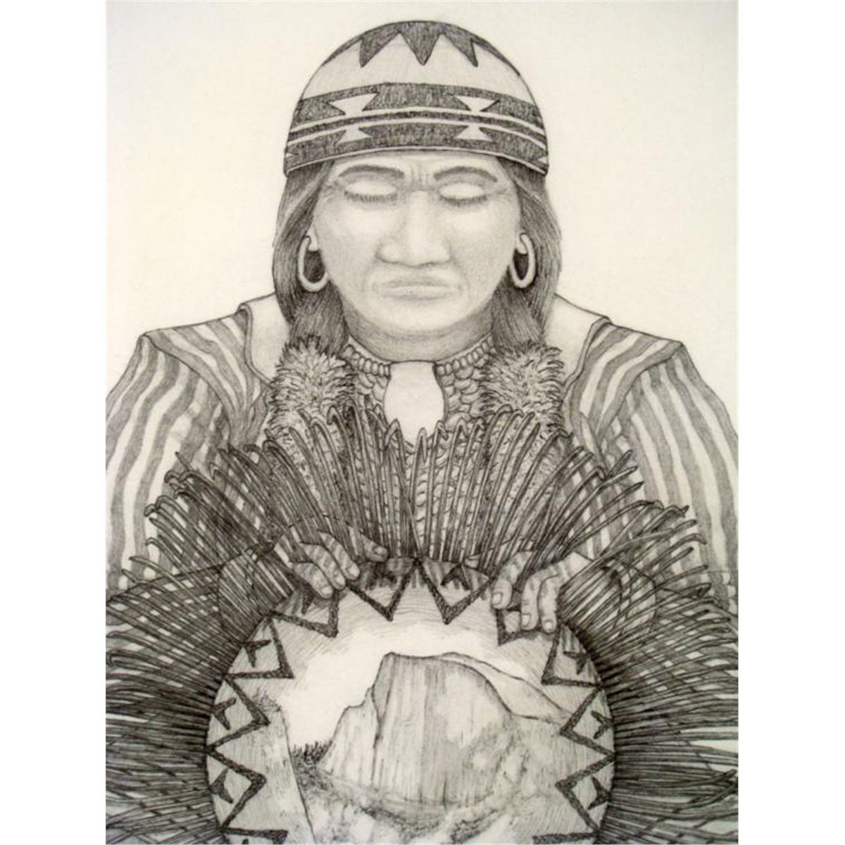 This print portrays a Native American woman weaving, and at the center of her work is a large rock formation. * Artist: Paul StoneSignature: In pencil, lower leftDate: 1999Medium: Print on paperImage size: 10 1/4 x 14 inchesFraming: Double matted in gray and black, in silver and black painted wood frameFrame size: 19 3/4 x 23 1/2 inches Condition: Excellent Biography: * "Paul was born and raised in Bishop, California on the Owens Valley Paiute Indian Reservation. He is full-blooded Paiute and Washoe and his native heritage is a great influence in his works of art. He is the Great-grandson of Tom Stone, Paiute chief & storyteller, Great-grandson of Captain John, past chief of Yosemite, grandson of Raymond Stone, world renowned sculptor, medicine man, & tribal spokesman, and is also related to Wavoka and other great leaders. Paul is proud to carry on these traditions through his art work. * Paul is a self taught artist and learns as he goes, and looks forward to learning many new types of media. He is fairly new to the art world, only drawing since 1995. He was forced out of construction by a knee injury, which was a blessing, for he was shown that art was his true calling. ( The Lord works in mysterious ways ! ) * Paul's works can be seen in many local and regional galleries & museums. His art can be found in private collections around the world. He has won program cover designs and awards and ribbons in graphics for his pencil drawings. Recently ,he was one of four runner ups for the California State Indian Seal." * -From the artist's website: www.paulstone.us *
