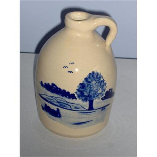 This attractive storage jug comes from Paul Storie Pottery in Marshall, Texas. It is hand-made and hand-decorated with a flow blue, cobalt type of glaze on a deep cream-colored stoneware background. The Paul Storie Pottery was established in 1981 in Marshall, Texas. Its product niche is food-usable stoneware in a range of items for serving and storing food.<p>