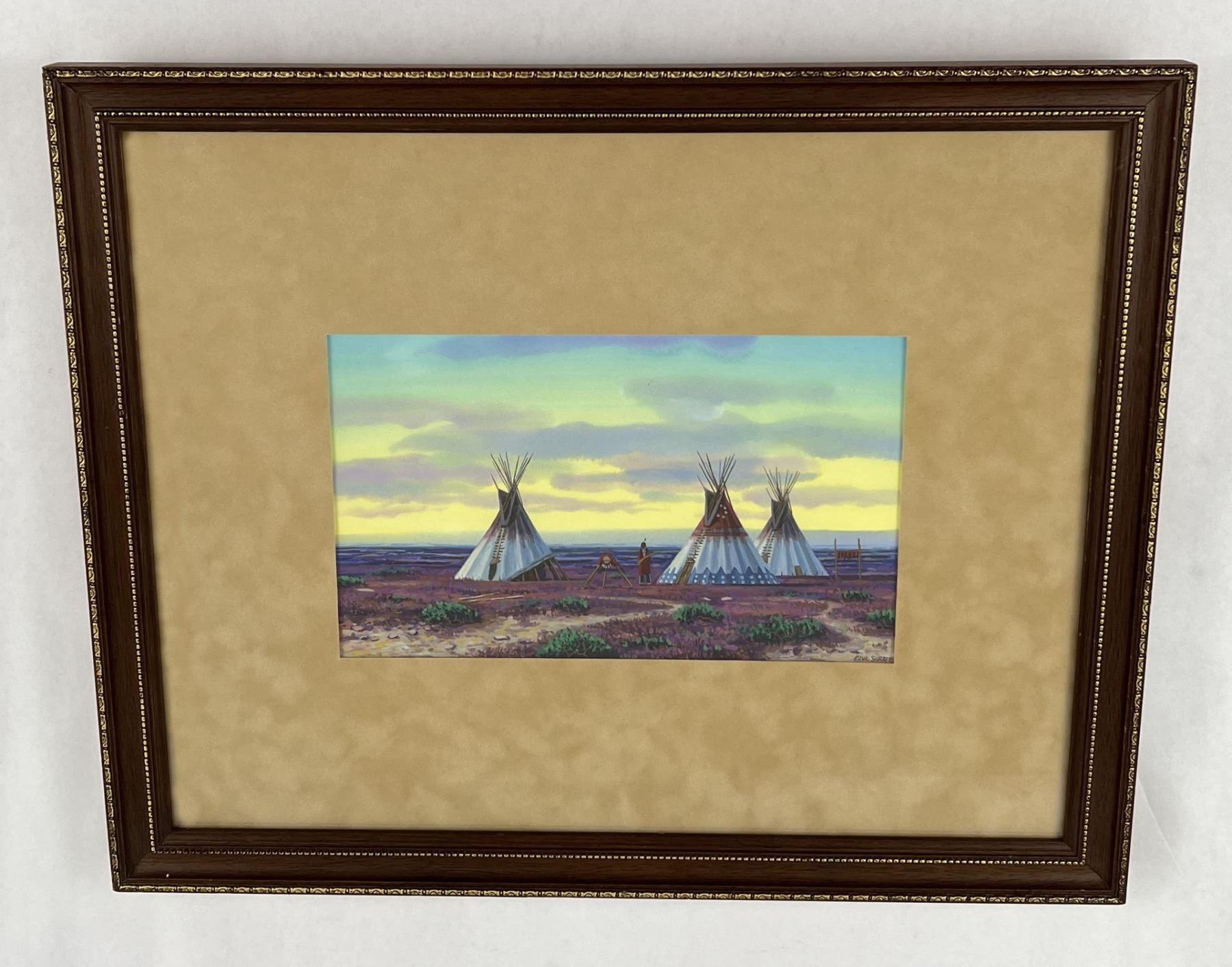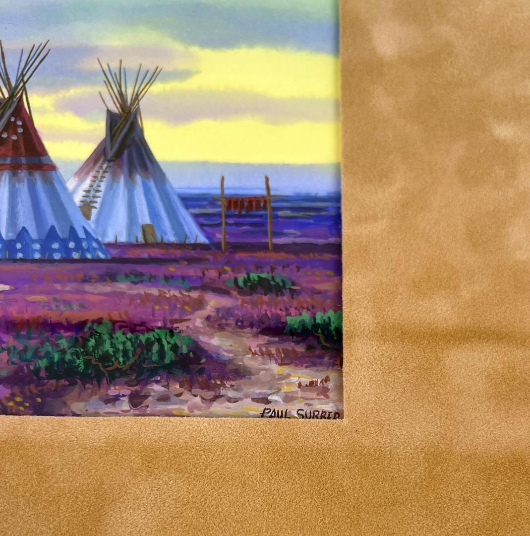 6" by 10" unframed, 15 1/4" by 18 1/2" framed. Paul Surber (Born 1942) is active/lives in Montana, New Mexico. Paul Surber is known for Frontier genre, Indians and landscape painting. Paul Surber was born in Redlands CA., in 1942. His first encounter with Indians was in a Parade when he was five years old. Attracted to the colorful and ornate costumes, he went home to draw with his crayons what he had seen. Paul has been drawing and painting Indians ever since. He is known for paintings of Indians and landscapes in oil, acrylic, and gouache. He has spent much of his life living close to the source of his inspiration, the Crow Indian Reservation in Montana and the Taos Pueblo in New Mexico. Surber now divides his time between Montana and Arizona. Paul has had so many great influences in his lifetime, from a childhood of roaming a museum as a young boy. Once a week his mother would drop him off with a sack lunch, which he would hide in the corner, as he spent the day wandering through the museum with admiration for the newest exhibit. Then a teacher realized that Paul, at a young age, had a learning disability and bought for him his first book on cowboys and Indians. The book instantly caught his interest and making it easier for Paul to learn to read. At a Fourth of July parade featuring Native American costumes Paul’s artistic imagination come to life. He was just five years old. Paul Surber made his way through life. As fate would have it he met an old German master artist who recognized his potential and with great discipline taught him that a good painting came from a good monochrome. He has used this method ever since. He created life long friendships in the art world, most were icons in their knowledge of Indian tribes and customs, which exposed him to original Indian artifacts. He would photograph and revisit time and time again to make sure his vision was represented as accurate as possible. At first, Paul started selling to the public his landscapes in gouache. He would travel mostly in Montana photographing locations along a river, mountain ranges or the prairies which the Indian tribes where believed to have traversed. Then he would add to the painting his vision of teepees, people, horses, drying racks and so on. He then moved to figurative paintings, first with a monochrome then finish with oil or acrylics. Paul’s greatest works are these portraits of chiefs, warriors and sometimes just the common native people. His discipline is never to paint without knowledge and deep understanding of the Native American culture.