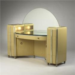 Paul T. Frankl, attribution illuminated vanity Frankl Galleries USA, c. 1930 lacquered wood, mirror, frosted glass, steel 66"w x 19.5"d x 54.25"h Four drawers on each side with a wide central drawer above two doors. The top surfaces are illuminated.