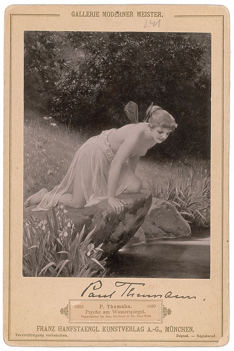 Master German illustrator and portrait painter (1834–1908). Scarce 4.25 x 6.5 cabinet photo of Thurman’s work entitled ‘Psyche am Wasserspiegel,’ signed below the image in black ink, and signed again on the reverse, adding a German sentiment and date of Berlin, December 13, 1894. Published by Franz Hanfstaengl Kunstverlag of Munich. In fine condition, with trivial chips to corners and a tiny pin hole to the top edge. This is the first Thumann autograph we have ever offered.