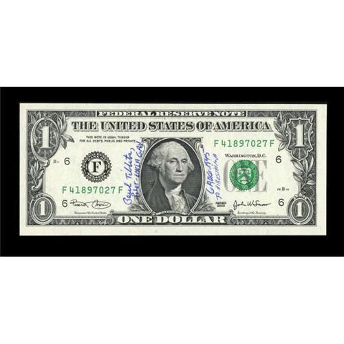 <B>Paul Tibbets - </B></I><B><I>Enola Gay </B></I></B></I><B>Pilot.</B></I><BR> Paul Tibbets was the pilot of the B-29 <I>Enola Gay </B></I> on its mission to drop the first atomic bomb on August 6, 1945. This $1 2003 FRN is signed "Paul Tibbets/Pilot Enola Gay/6 Aug. 1945/to Hiroshima." Brigadier General Tibbets passed away on November 1, 2007 at the tender young age of 92.<BR><BR><b>Shipping:</b> Coins & Currency (<a target="_blank" href="http://www.heritageauctions.com/common/shipping.php">view shipping information</a>)