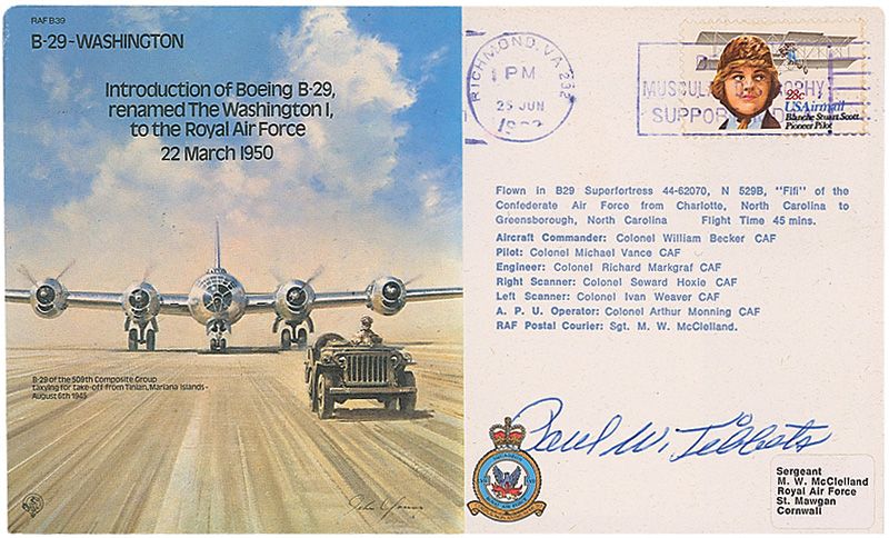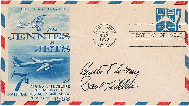 Limited edition flown commemorative cover, 7.5 x 4.5, with a color cachet honoring the introduction of the Boeing B-29, signed in blue ballpoint by Paul Tibbets; and an FDC with a cachet honoring “from Jennies to Jets,” signed in black felt tip by Curtis LeMay and Paul Tibbets. In fine condition, with a uniform shade of toning to FDC.