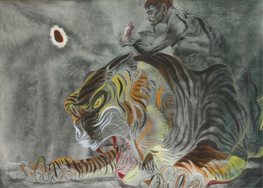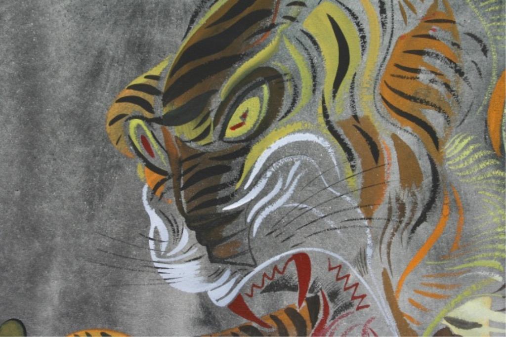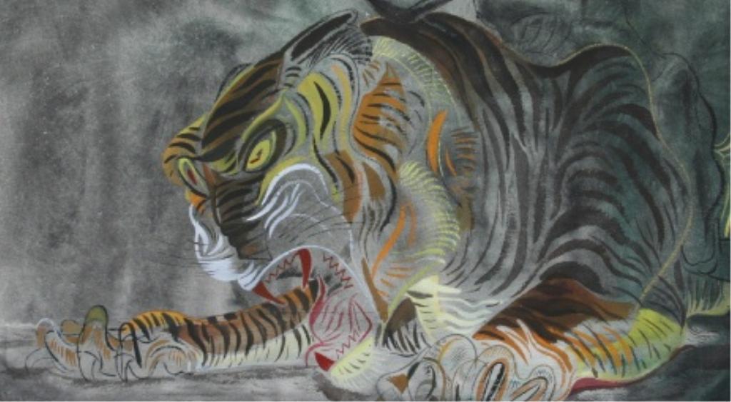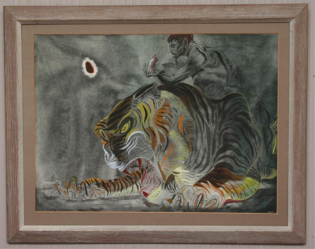 Paul Bough Travis (American, Cleveland School, 1891-1975), "Tiger", pastel on paper, 1951, signed on graphite on verso July 1951 Price $50, No. 17 in Akron Exhibition, Paul B. Travis", matted and framed. 21" x 28" (paper). 26 1/2" x 33 1/4" (framed). Condition: good.