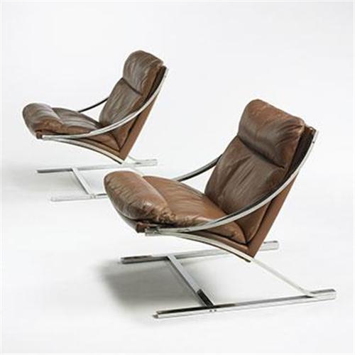 Paul Tuttle<BR>Zeta lounge chairs, pair<BR>Strassle International<BR>USA, 1968<BR>chrome-plated steel, leather<BR>26.5 w x 29.5 d x 28.5 h inches<BR>Signed with decal manufacturer's label to underside of each example: [Zeta Collection Strassle International Made In Switzerland].<BR>Literature: <BR><i>Paul Tuttle Designs</i>, Berns, ppg. 48-49<BR><BR>Condition of the item is not included in this description. Condition reports are available from Wright upon request. Wright strongly recommends that you review a condition report for each item on which you plan to bid.