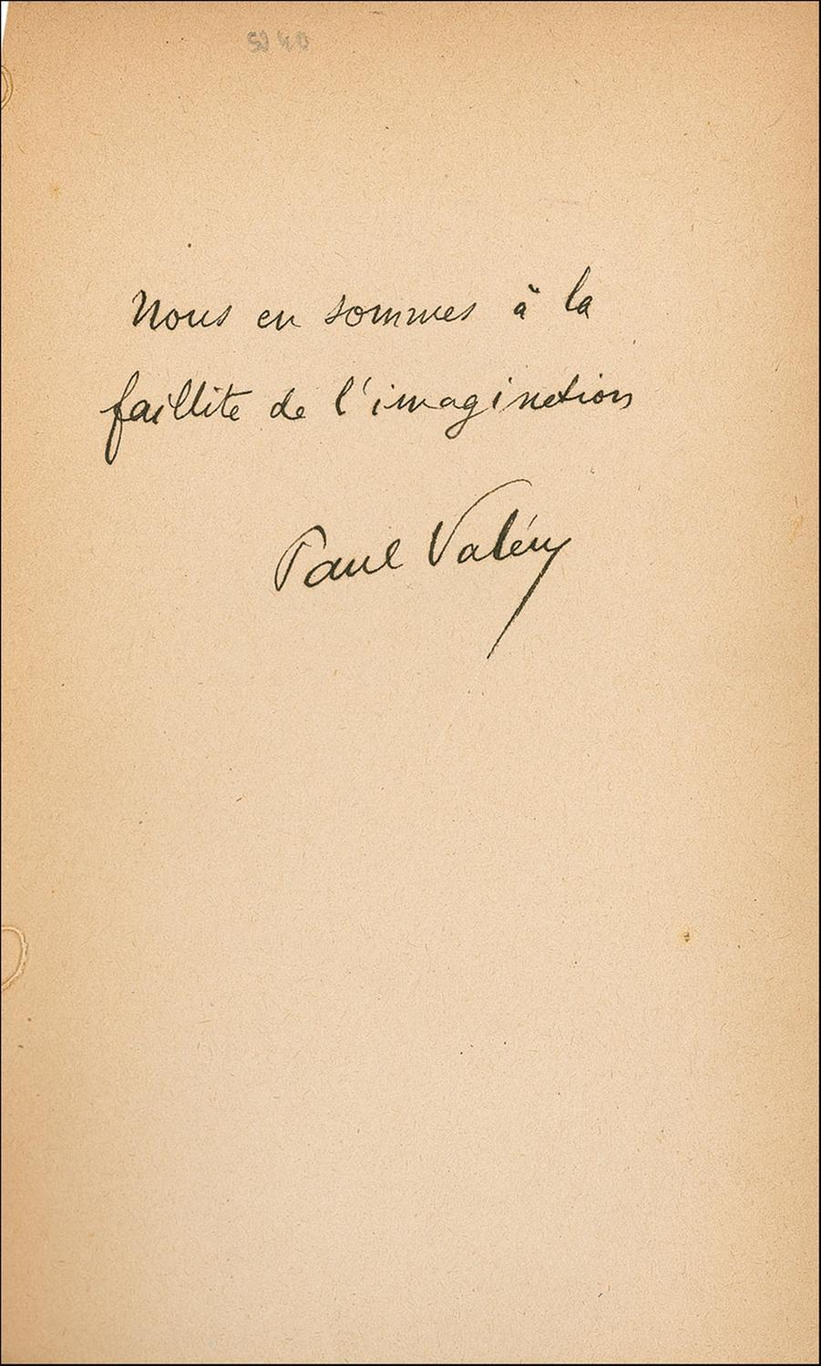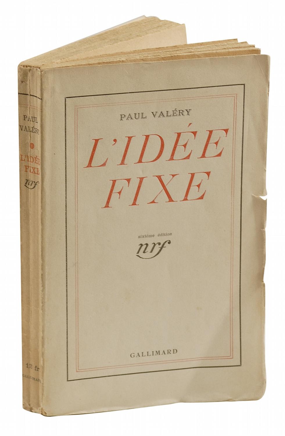 French poet, essayist, and philosopher (1871-1945). Signed book: L’Idee Fixe. First edition, first printing. Paris: Gallimards, 1934. Softcover, 4.75 x 7.25, 207 pages. Signed on the first free end page, in French (translated): “We are at the time of failure of imagination. Paul Valéry.” In very good condition, with toning to signed page, as well as a crease to lower right corner, uniform toning to inside pages, spine a bit weak, and scattered toning, creasing, and soiling to covers and the moderately-sunned spine.