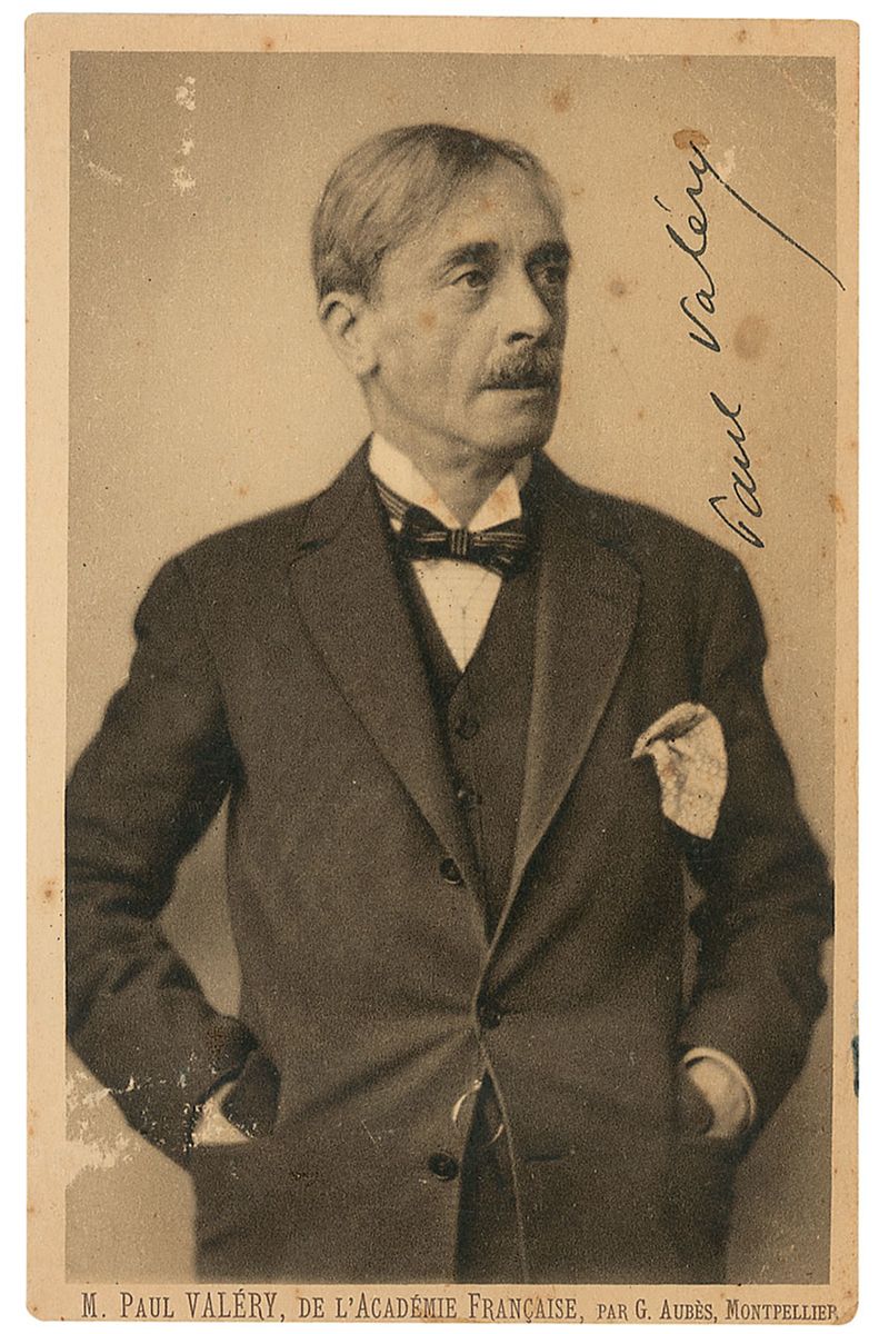 French poet, essayist, and philosopher (1871-1945). Vintage 3.5 x 5.5 postcard photo, signed vertically in fountain pen. In very good condition, with scattered spotting to image and background, a few creases, and a couple areas of some slight surface loss.