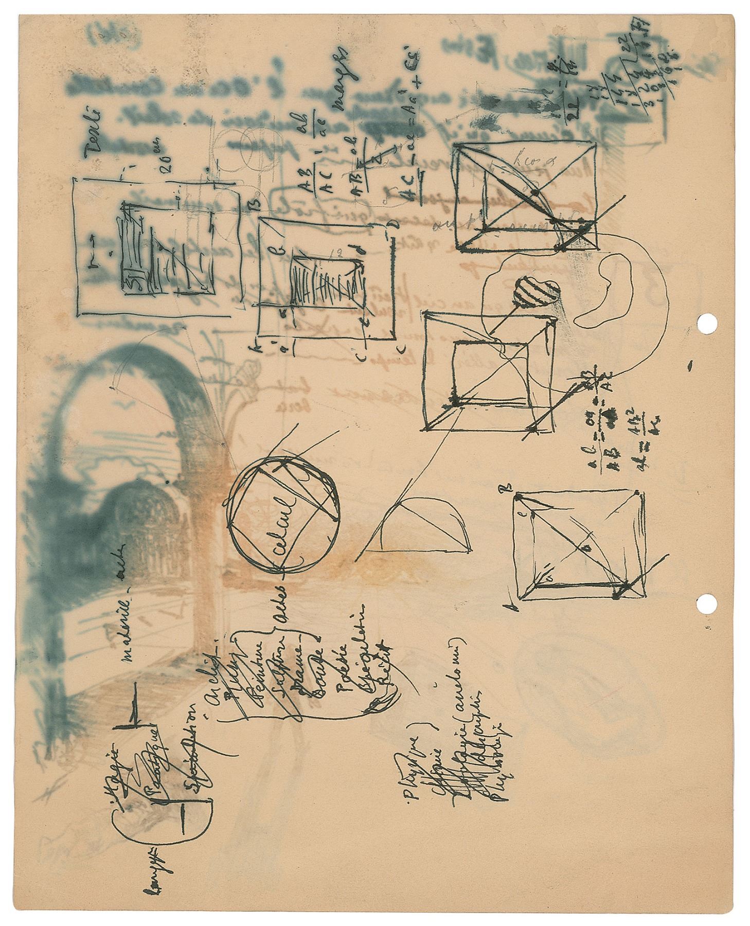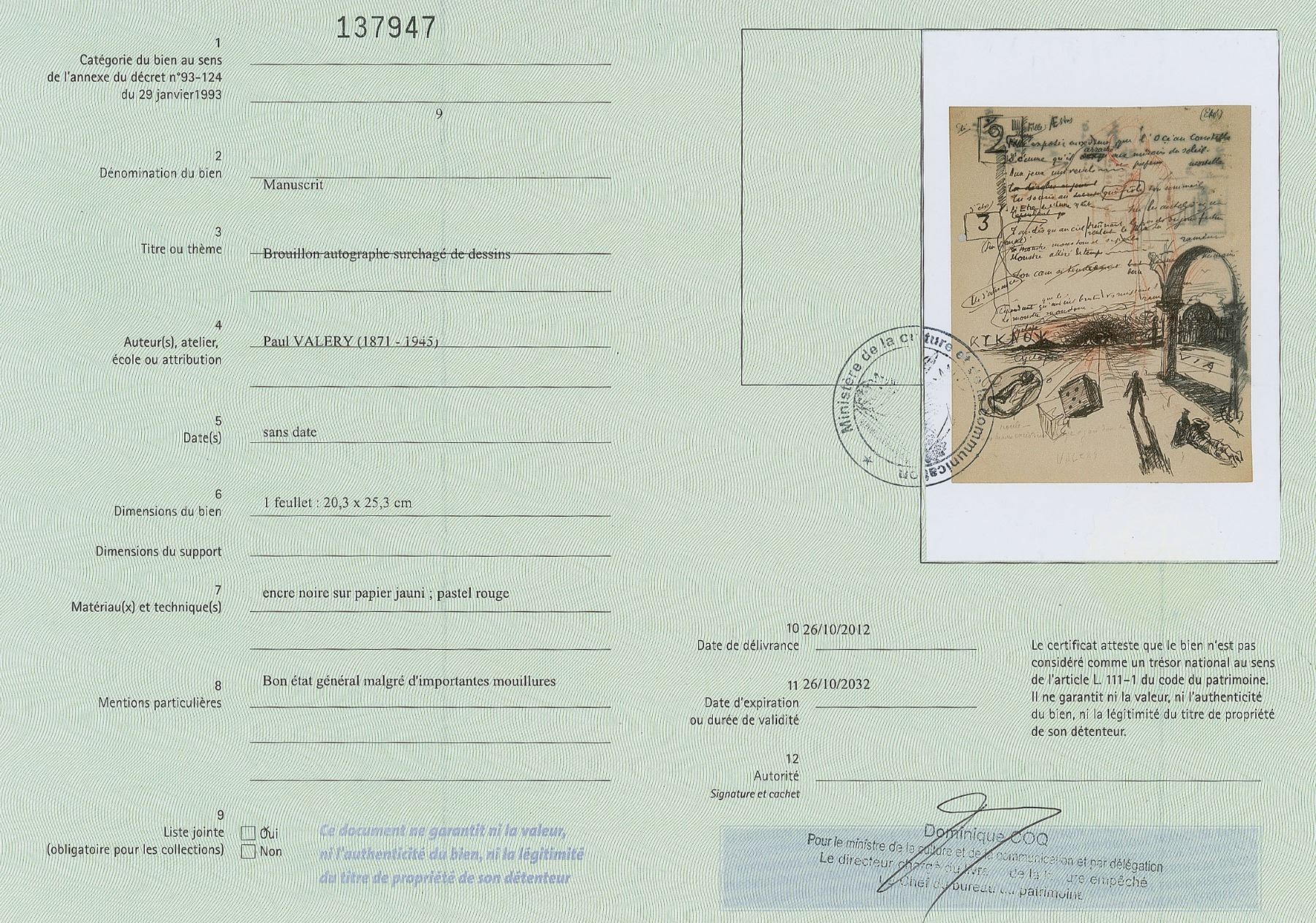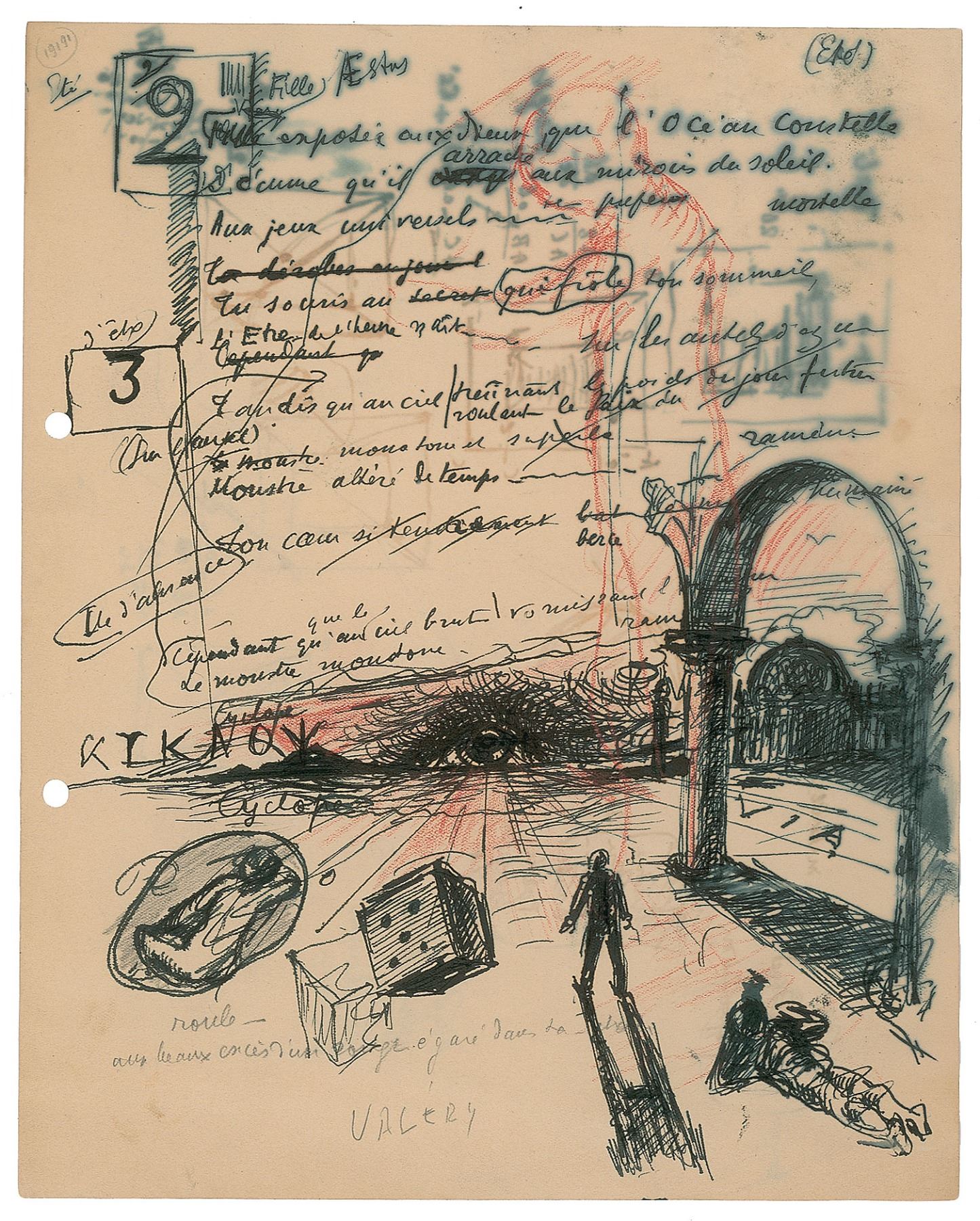 French poet, essayist, and philosopher (1871–1945). Handwritten manuscript in French and sketches by Valery, unsigned, one page both sides, 8 x 10, no date. A beautiful and witty manuscript illustrated with superb, dreamlike drawings curiously evoking the universe of Salvador Dali. One can decipher in particular (translated): "Girl, Aestus, exposed to the Gods, whom the ocean constellates." The poem, in the draft form, largely crossed out, carries in left and right margins the word "summer" (which seems to be the title), but it differs totally from the work published under the same title published in the 'Album des vers anciens.' In very good to fine condition, with two file holes to the left edge, and light dampstaining to the right side.