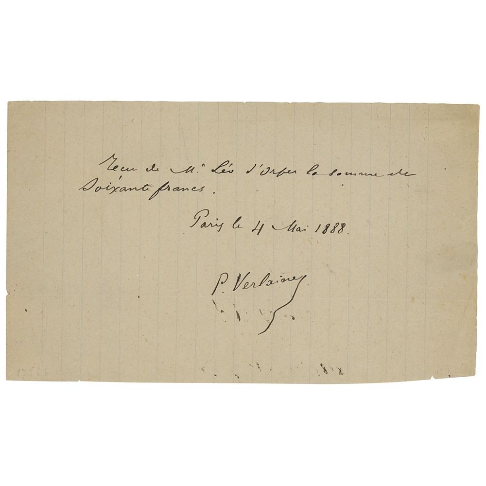 ADS in French, signed “P. Verlaine,†one page, 7.75 x 4.5, May 11, 1888. Pay order in the hand of Paul Verlaine, who directs a total of 60 francs to French journalist Leo d'Orfer. In fine condition.