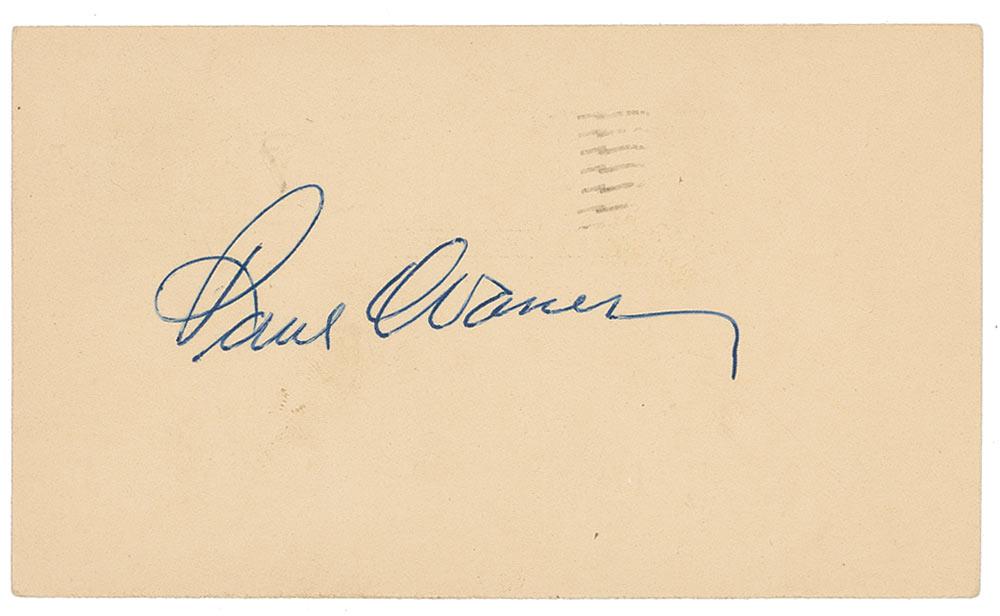 Hall of Famer (1903-1965), nicknamed ‘Big Poison,’ who captured three National League batting titles and became a member of the exclusive 3,000 hit club. Vintage ballpoint signature, “Paul Waner,” on an off-white 5.5 x 3.25 government postcard (postmarked 8/30/1949). In fine condition, with a bit of trivial soiling, and light postal cancellation to top.