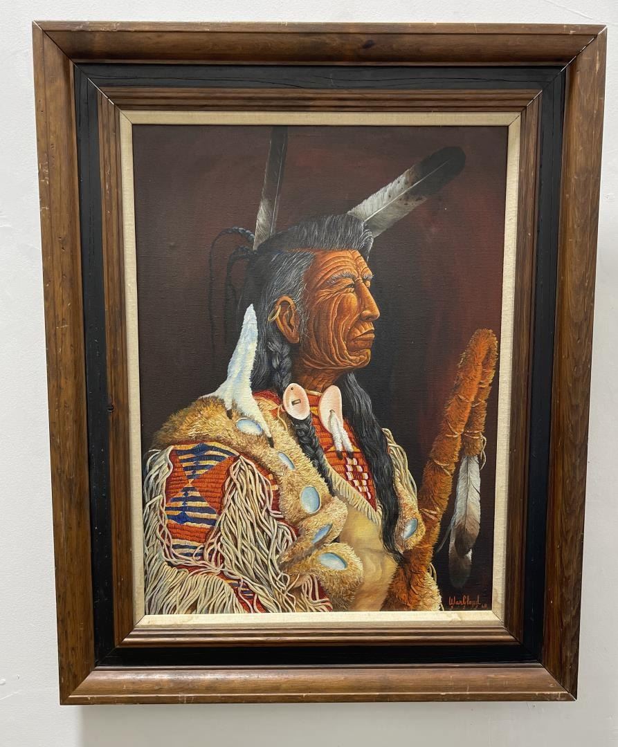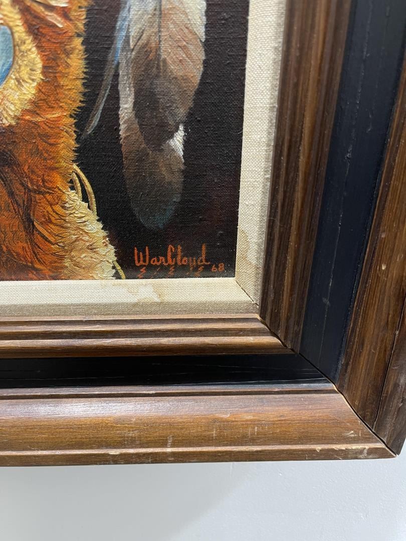 31 5/8" by 25 3/8" framed. Paul War Cloud (1930 - 1973) was active/lived in South Dakota. Paul War Cloud is known for Painting of Sioux American Indian in natural settings, writer. Paul Warcloud was an author, artist and publisher. To help preserve Sioux language and traditions, he wrote and published a Dakota Sioux-English dictionary. His artwork is on permanent exhibition in the Gladys and Edgar Light Collection at Northern State University. Allard Auction Collection Inv: KAP 34789