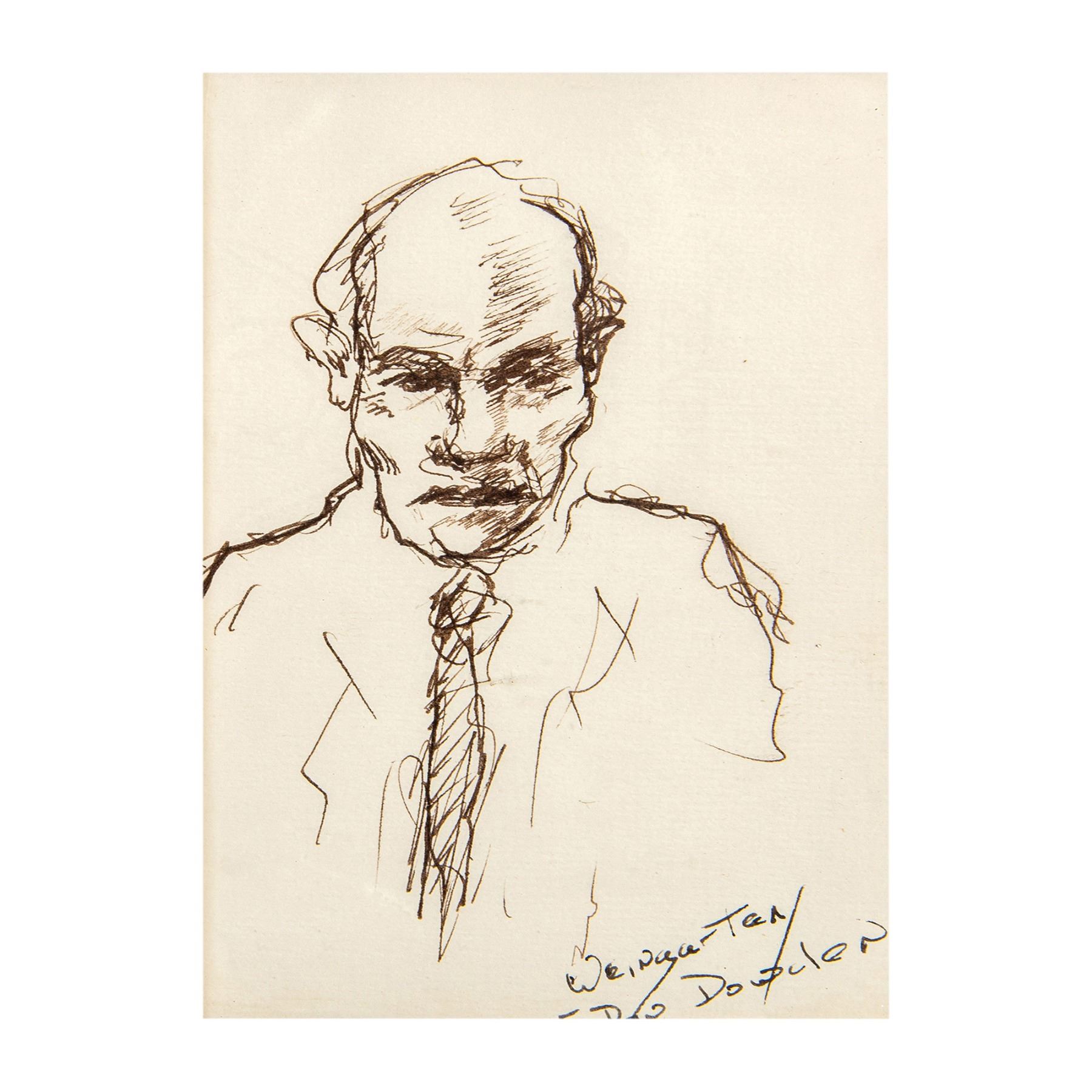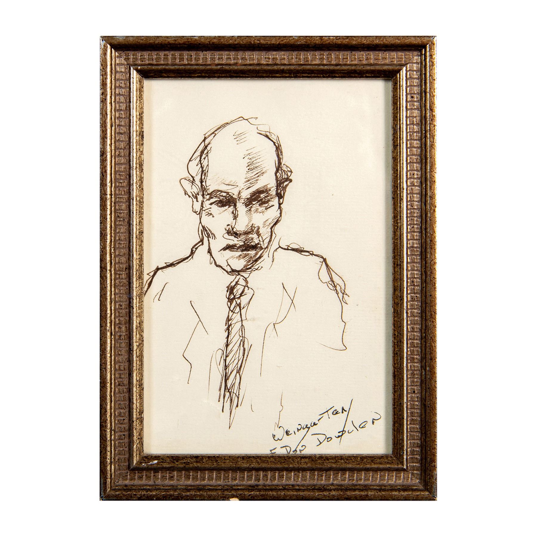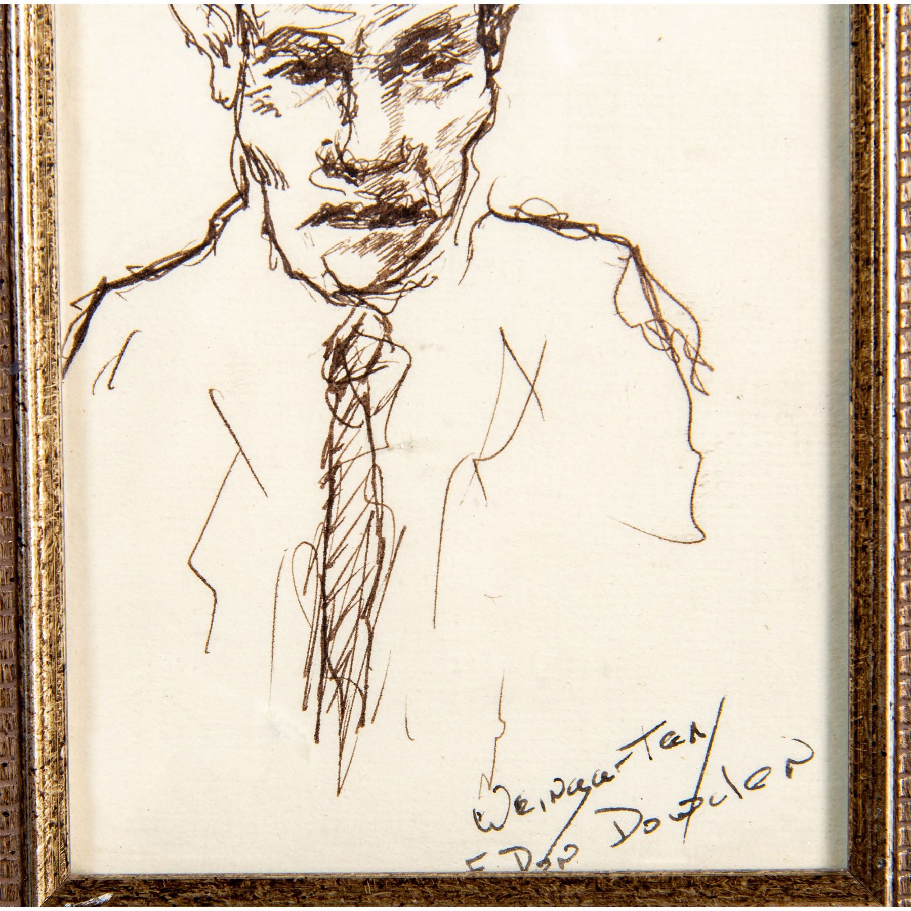 Framed gesture sketch in brown ink on paper depicting an elderly man with a surly expression wearing a suit. Signed by artist in lower right corner, Weingarten/of Don Dowden. Silver metallic tone wood frame with glaze. Sight size: 3.5"W x 5.5"H; frame: 5"W x 7"H x 0.75"D.