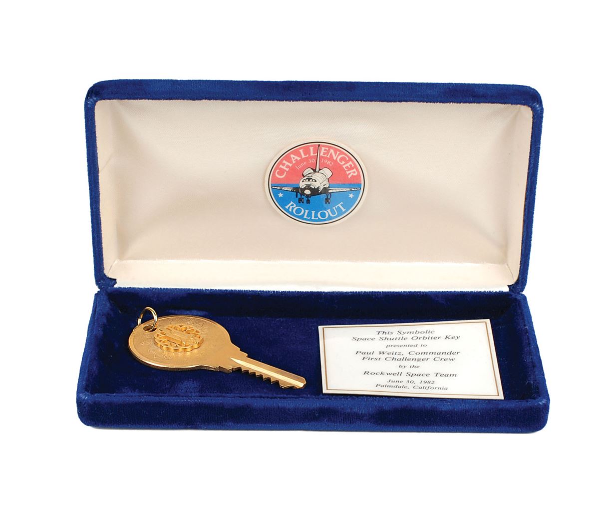 Symbolic Space Shuttle Orbiter key presented by the Rockwell Space Team to STS-6 mission commander Paul Weitz, dated June 30, 1982, Palmdale, California, measuring 2.75? long, with an elaborate raised design of the Space Shuttle on the front and “Challenger” engraved on the reverse. The gold key is connected to a small ring and housed in a royal blue 6.25 x 1.25 x 3.25 velvet presentation box, affixed with a name label to the top cover, and a presentation card and Challenger rollout sticker to the interior. In fine condition, with mild scratching to the “Challenger” side of the key. A beautifully ornate orbiter key bestowed upon an astronaut who logged just over 793 total hours in space.