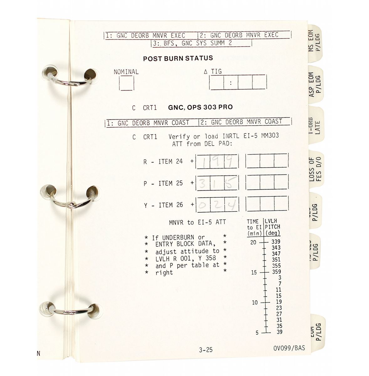 Complete full STS-6 Entry Checklist, flown into orbit on board Space Shuttle Challenger during the STS-6 mission. Checklist measures 5.5 x 8, is bound with its three original rings to the left border, and contains 104 pages (52 individual sheets). Arranged into 11 tabbed sections, the manual covers the process for maneuvering and setting up for deorbit, as well as the processes for landing, turning off critical systems of the Shuttle, and egressing the orbiter. There are 13 pages with in-flight writing by Paul Weitz, shuch as various numbers and check marks as procedures were completed. Also interesting are handwritten notations on egress page, noting: “Return to Houston: FDF, Debrief Guide, Film, VTR Tapes, Cassette Tapes, PPK, Pictures, Etc.” Signed on the front cover in black felt tip by Weitz, “Flown on STS-6, Paul Weitz, CDR,” and signed by Weitz inside the front cover with a handwritten letter of provenance, in full: “I hereby certify that this Entry Checklist was flown aboard the Space Shuttle Challenger on STS-6. It was utilized to ensure that all necessary evolutions occurred as required. It is from my personal collection of artifacts.” In fine condition. Complete shuttle checklists are rare, as many are broken up page by page. This is a particularly fascinating example as it details one of the most critical moments in spaceflight and comes from a historic mission, STS-6 being Space Shuttle Challenger’s first journey into orbit.