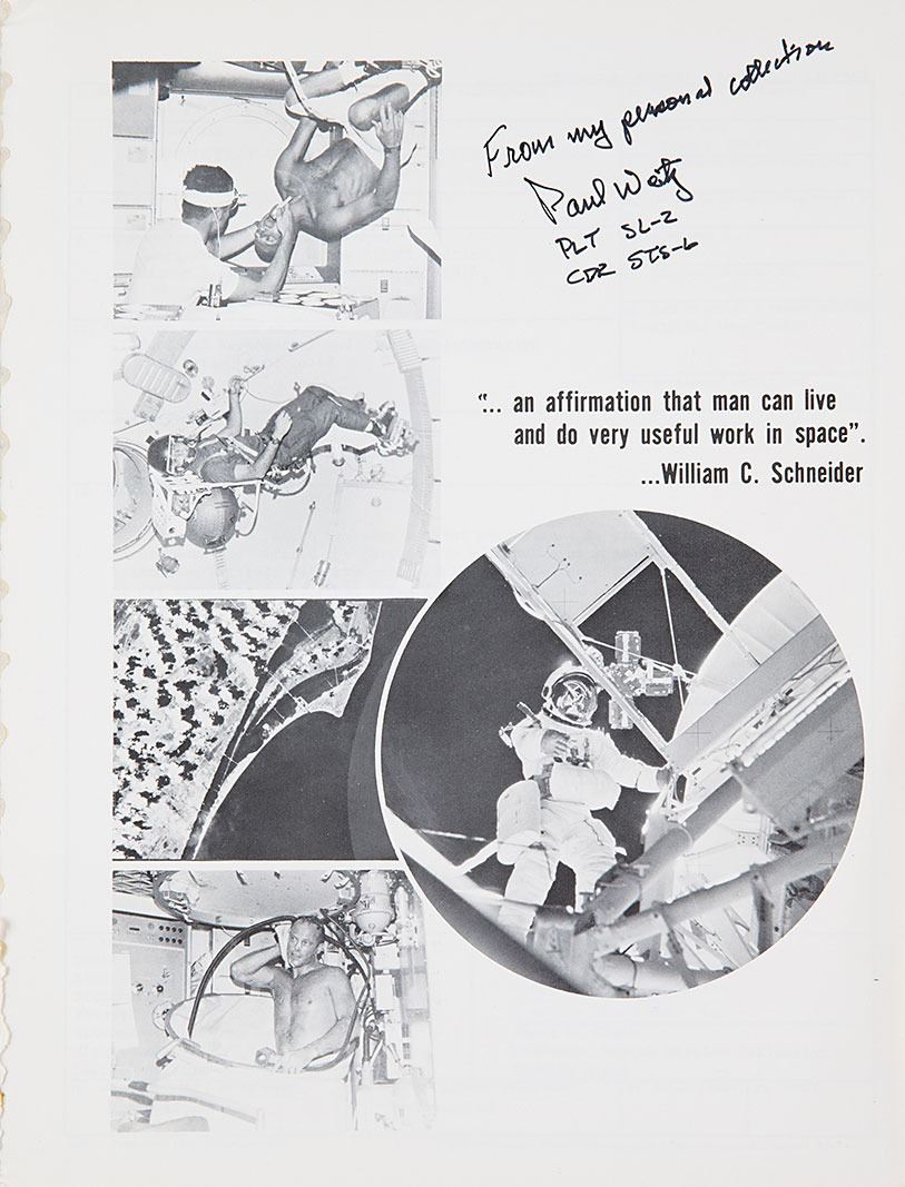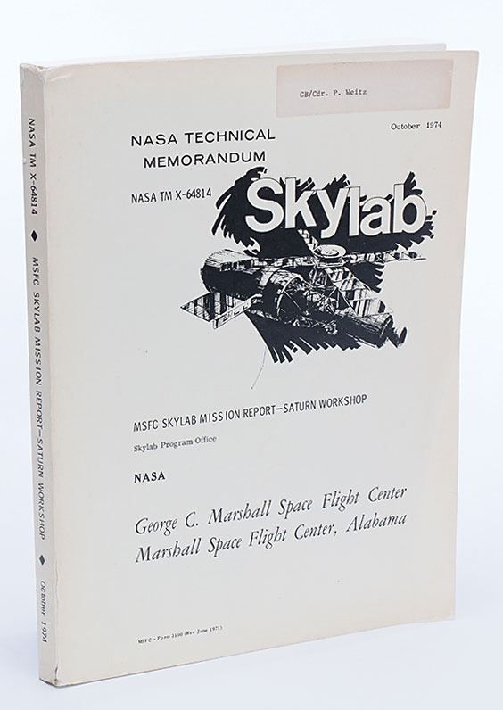 Paul Weitz’s NASA-printed mission report manual for Skylab 2 (SLM-1), dated October 1974, 8.5 x 11, signed on the opening page in black felt tip, “From my personal collection, Paul Weitz, PLT SL-2, CDR STS-6.” The manual, entitled “MSFC Skylab Mission Report—Saturn Workshop,” Report No. “NASA TM X-64814,” presents the mission performance of SLM-1 through a series of 12 sections: Introduction, Configuration, Mission Summary, Structures and Mechanisms, Instrumentation and Communications, Attitude and Pointing Control, Electrical Power, Thermal Control, Laboratory Atmosphere, Crew Systems, Contamination, and Experiments. Upper right of front cover features an affixed ownership label: “CB/Cdr. P. Weitz.” In fine condition, with light wear from use, and the cover partially detached.