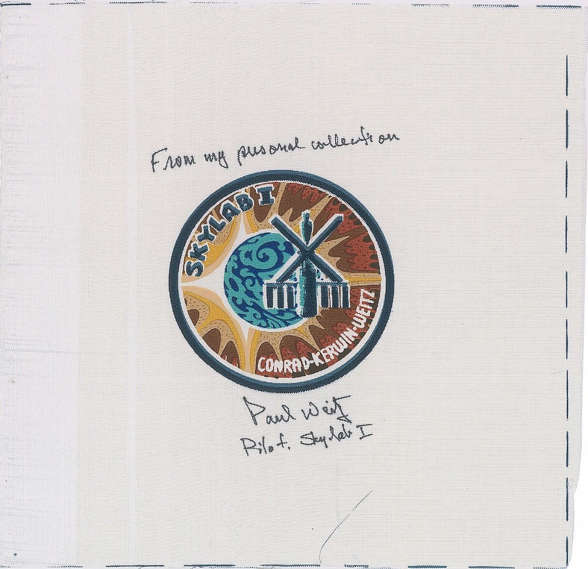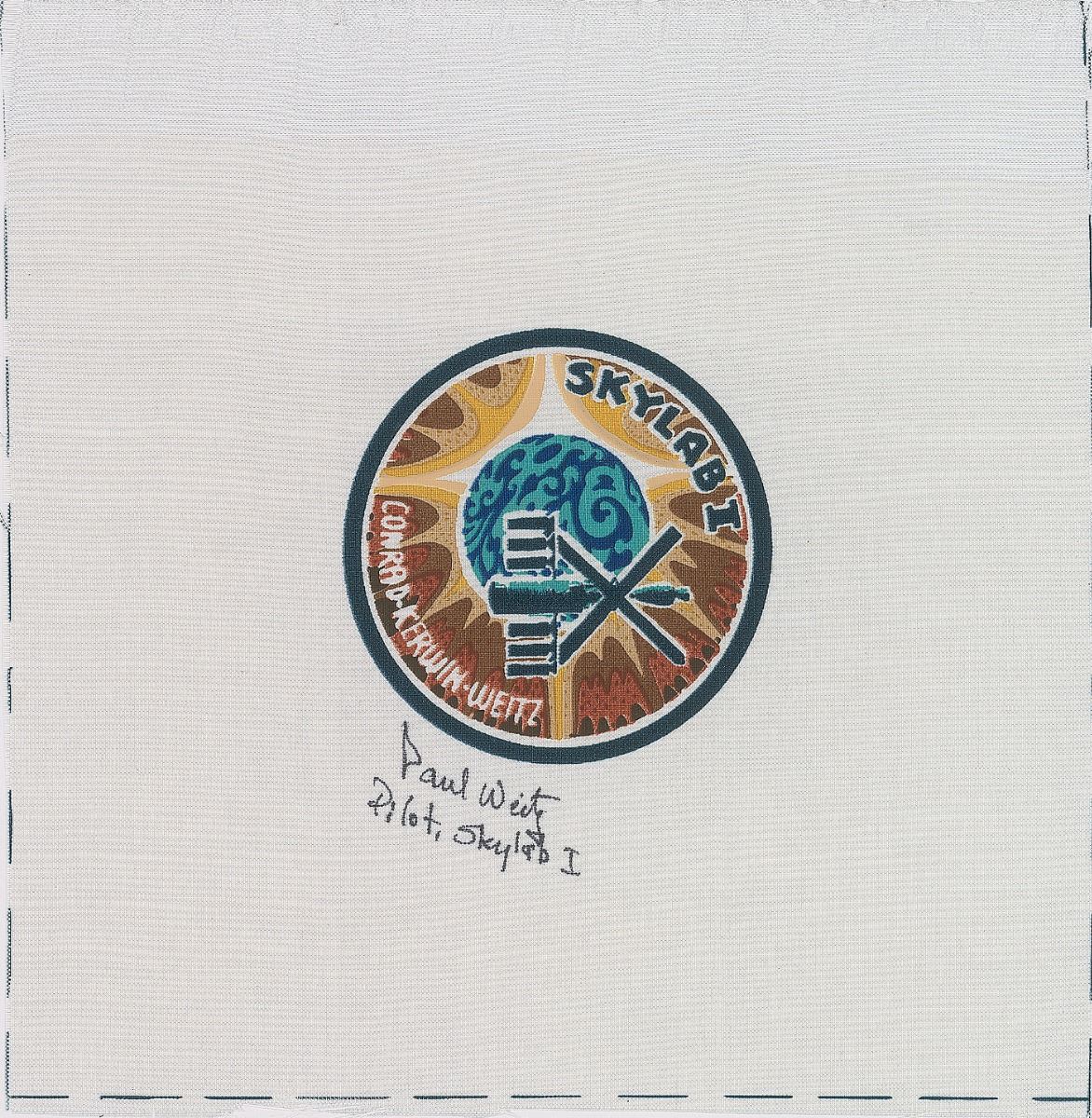 Two Beta cloth swatches, both approximately 9.25 x 9 and bearing a 3.5? diameter Skylab I (SL–2) mission insignia in the center, both signed in black felt tip, “Paul Weitz, Pilot Skylab I,” with Weitz adding to one, “From my personal collection.” In overall fine condition.