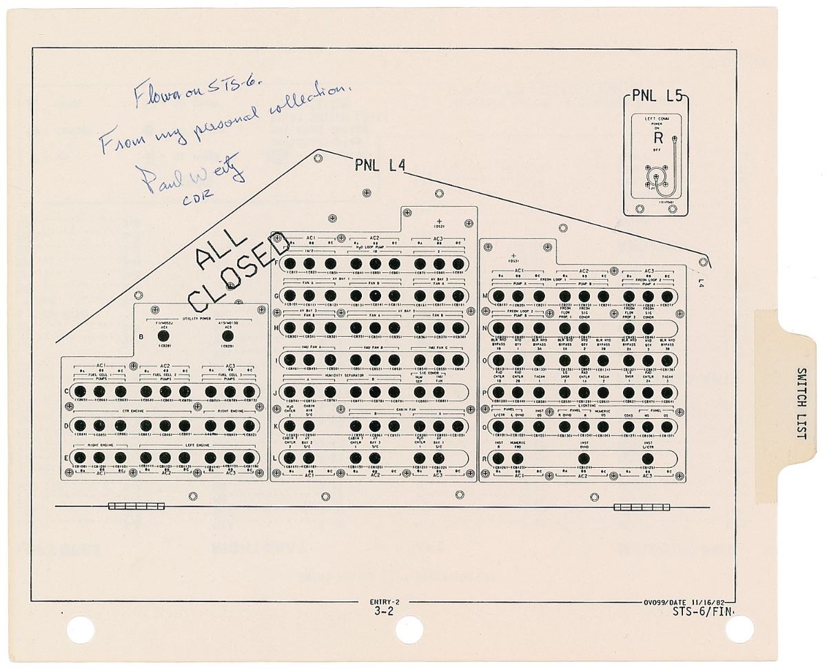 Flown two-sided checklist page carried on board STS-6, 10.5 x 8.5, signed and flight-certified on one side in blue ballpoint, “Flown on STS–6. From my personal collection, Paul Weitz, CDR.” Consisting of pages 1 and 2 of section 3, one side features panels L4 and L5, and the other depicts an “Entry Switch List/Verification,” with sections for “Left Seat,” “Right Seat,” “AFT,” “Middeck-FWD,” “Middeck–AFT,” and “Airlock,” with a tab labeled “Switch List.” In fine condition.