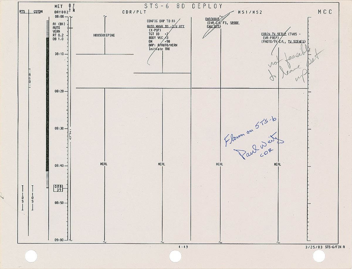 Flown two-sided checklist page carried on board STS-6, 10.5 x 8, dated March 25, 1983, signed and flight-certified on one side in blue ballpoint, “Flown on STS–6, Paul Weitz, CDR.” Consisting of pages 48 and 49 of section 4, headed at the top, “STS–6 8D Deploy,” with both sides featuring a mission elapsed time bar for Day 2, and sections for “CDR/PLT,” “MS1/MS2,” and “MCC.” Both sides bear pencil notations. In fine condition.