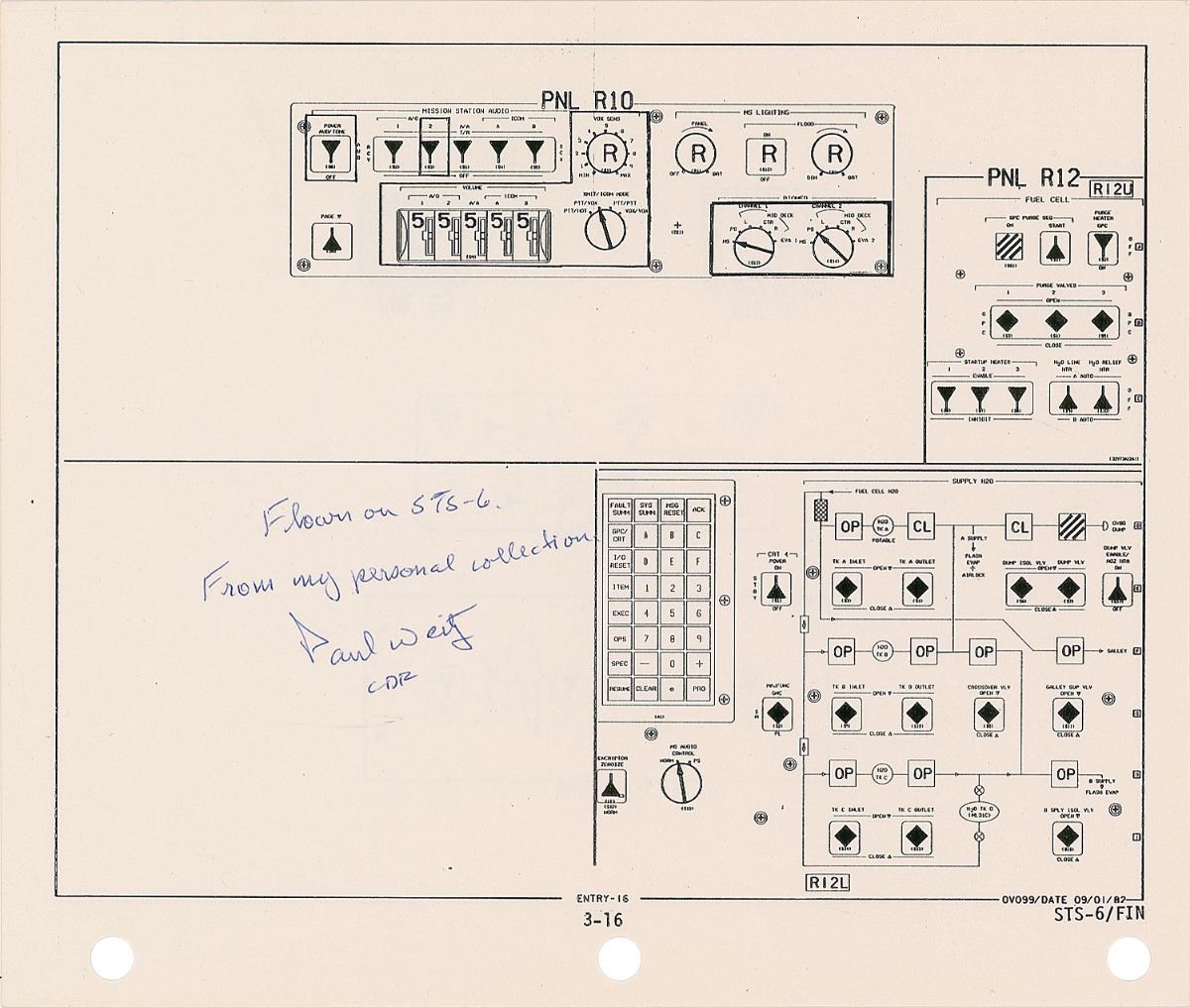 Flown two-sided checklist page carried on board STS-6, 10 x 8.5, dated September 1, 1982, signed and flight-certified on one side in blue ballpoint, “Flown on STS–6. From my personal collection, Paul Weitz, CDR.” Consisting of pages 15 and 16 of section 3, one side features panels C5, C7, C6, and 19, and the other depicts panels R10 and R12 (U and L). In fine condition.