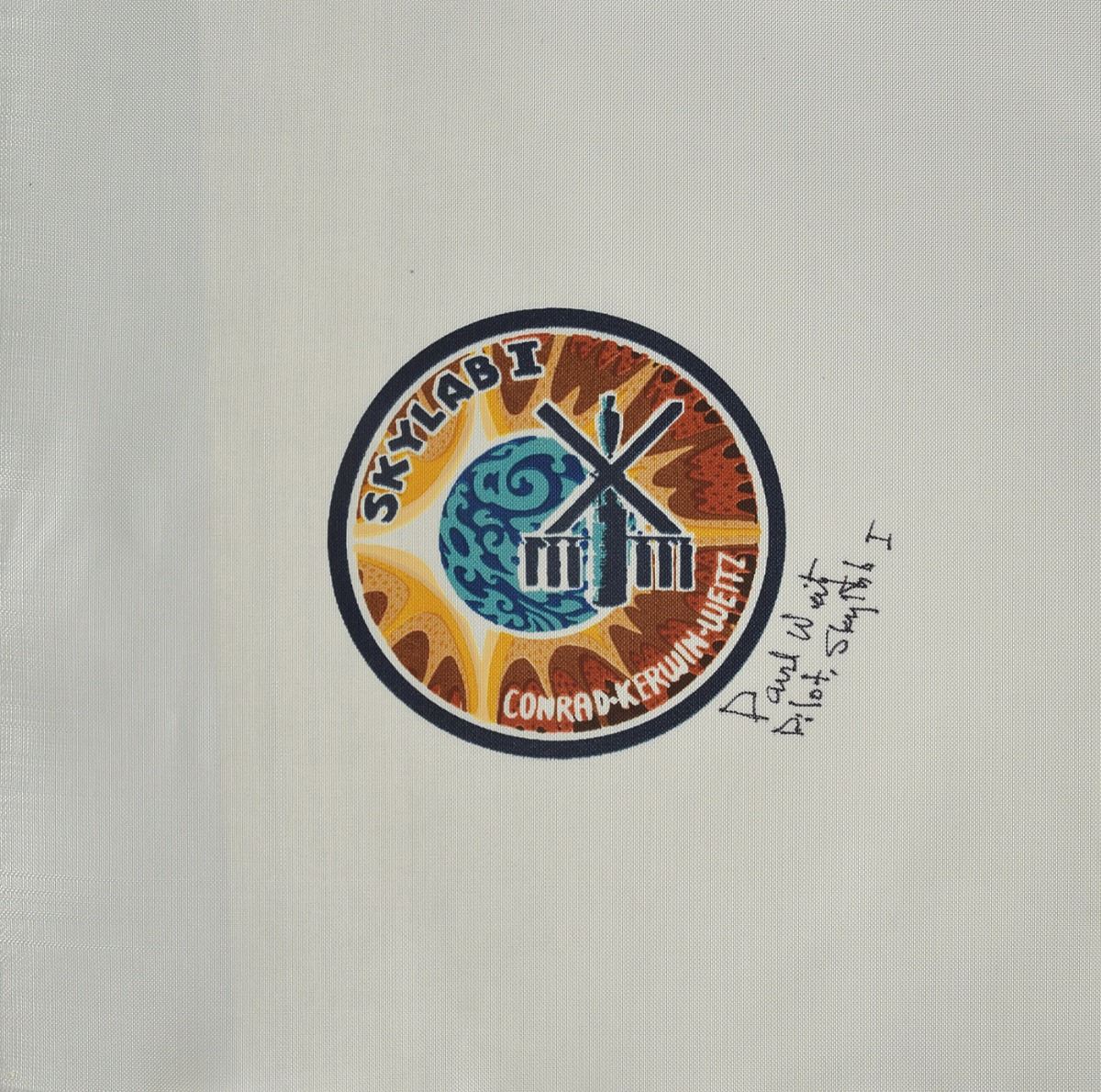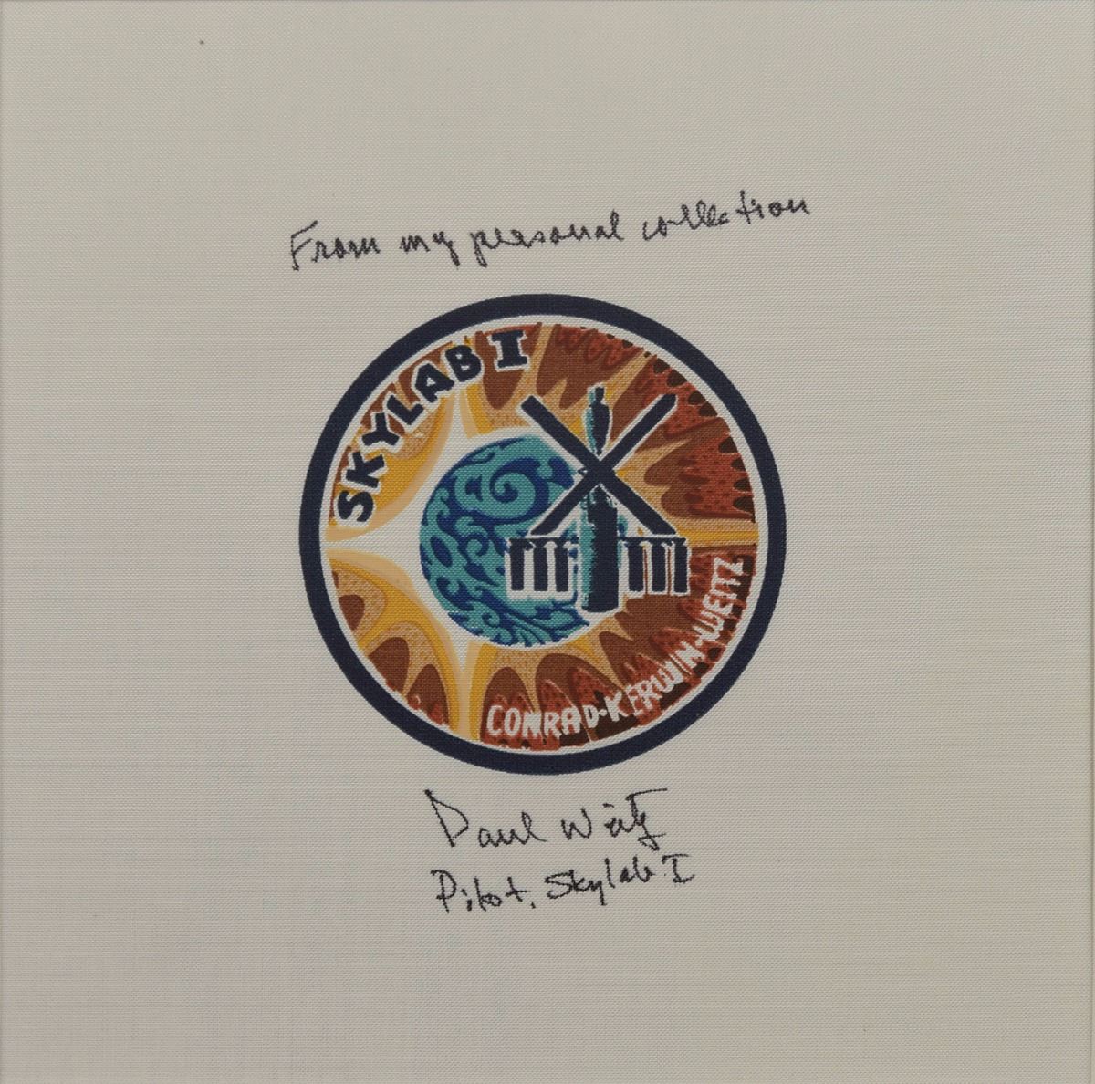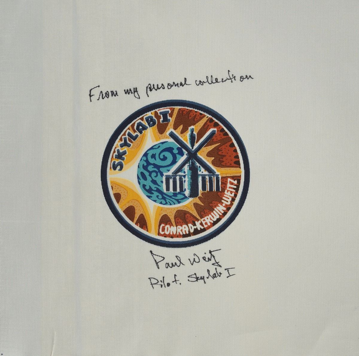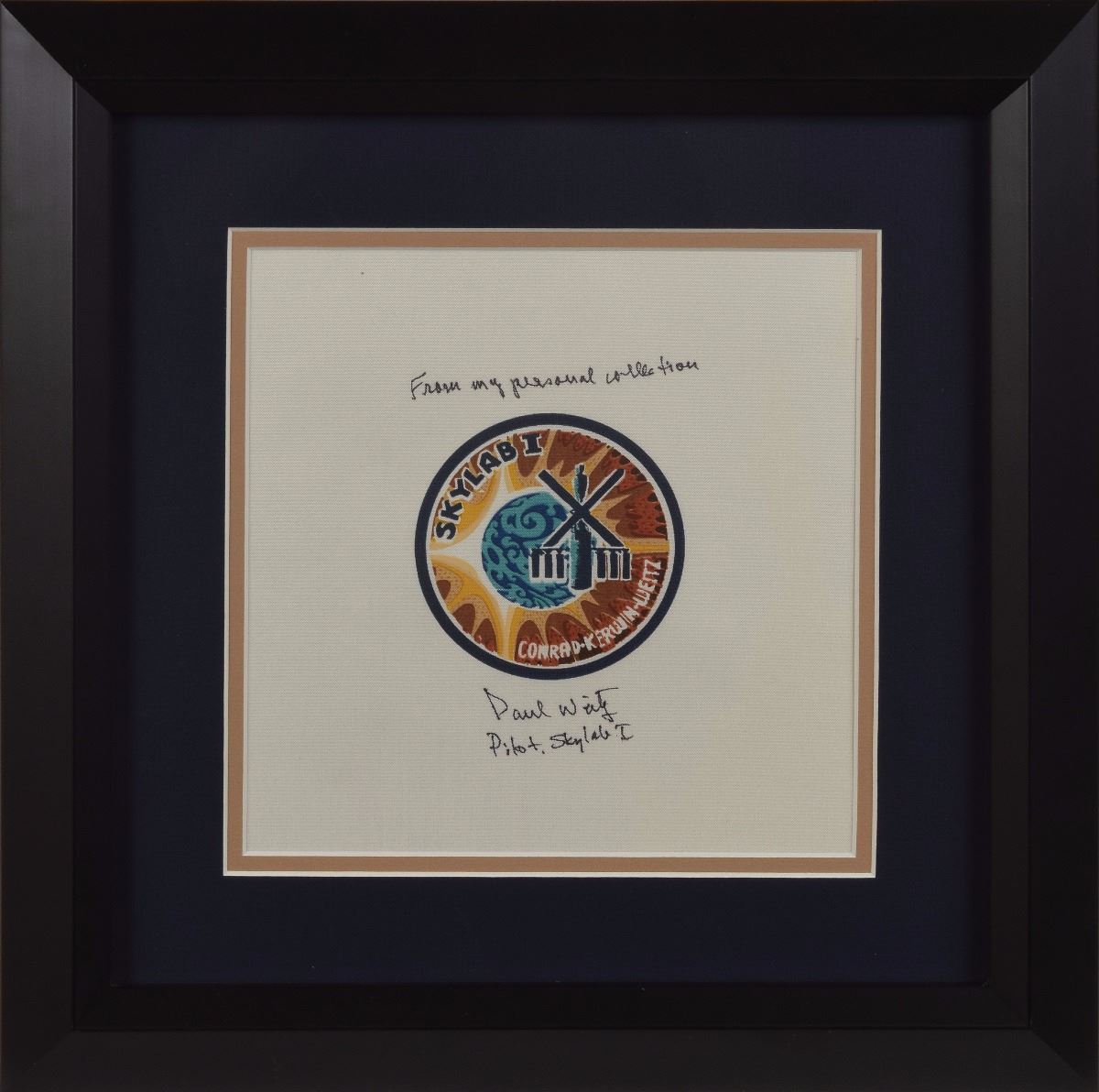 Five Beta cloth swatches bearing 3.5? diameter Skylab I (SL-2) mission insignias in the center, each approximately 9 x 9, all signed in black felt tip, "Paul Weitz, Pilot, Skylab I," with Weitz adding to three, "From my personal collection." One is double-matted and framed to an overall size of 14.5 x 14.5. In overall fine condition. Originating from the Astronaut Scholarship Foundation, a portion of the proceeds for the sale of these items will be donated to the ASF.