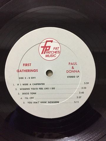 "Paul and Donna, First Gatherings" vinyl record, 9 songs between both sides, songs include "I Believe in Music", "Send in the Clowns", "I'll cry", etc., autographs from Paul & Donna on album cover with a personal message stating "To George Class, you are truly a genuine person- we are proud to know you and hope to hear from you soon - Love, Paul and Donna", back cover shows 3 personal home candid photos, front cover shows one photo of Paul and Donna standing in a field.