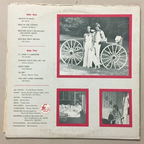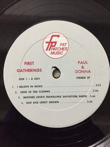 "Paul and Donna, First Gatherings" vinyl record, 9 songs between both sides, songs include "I Believe in Music", "Send in the Clowns", "I'll cry", etc., autographs from Paul & Donna on album cover with a personal message stating "To George Class, you are truly a genuine person- we are proud to know you and hope to hear from you soon - Love, Paul and Donna", back cover shows 3 personal home candid photos, front cover shows one photo of Paul and Donna standing in a field.