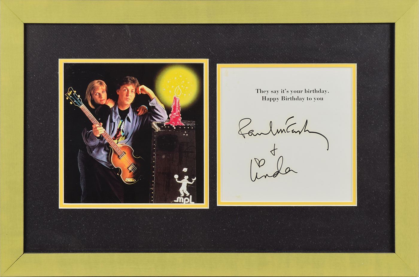 Large felt tip signatures, "Paul McCartney" and "& Linda," on the inside of a 6.5 x 6.5 birthday card bearing preprinted text, "They say it's your birthday. Happy birthday to you." Nicely double-matted and framed with an image of the couple to an overall size of 20.5 x 13.5. In fine condition, with very subtle ink haloing. Accompanied by letters of authenticity from Jeff Gold of Recordmecca and noted Beatles expert Frank Caiazzo, who affirms that the signatures date to the early 1990s.