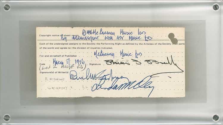 Self-contained partial DS, one page, 6 x 2.75, March 17, 1976. A portion of a larger document which listed shares of royalties for McCartney’s song “Let ‘Em In”, filled out in another hand on behalf of McCartney Music, boldly signed in blue ink, “Paul McCartney,” and “Linda McCartney.” Document is removably housed in a Lucite holder and accompanied by a 45 rpm of the song, as well as a copy of the sheet music for the song. In fine condition, with a few light creases, two punch holes to top right, and light show-through from a PSA label on reverse.