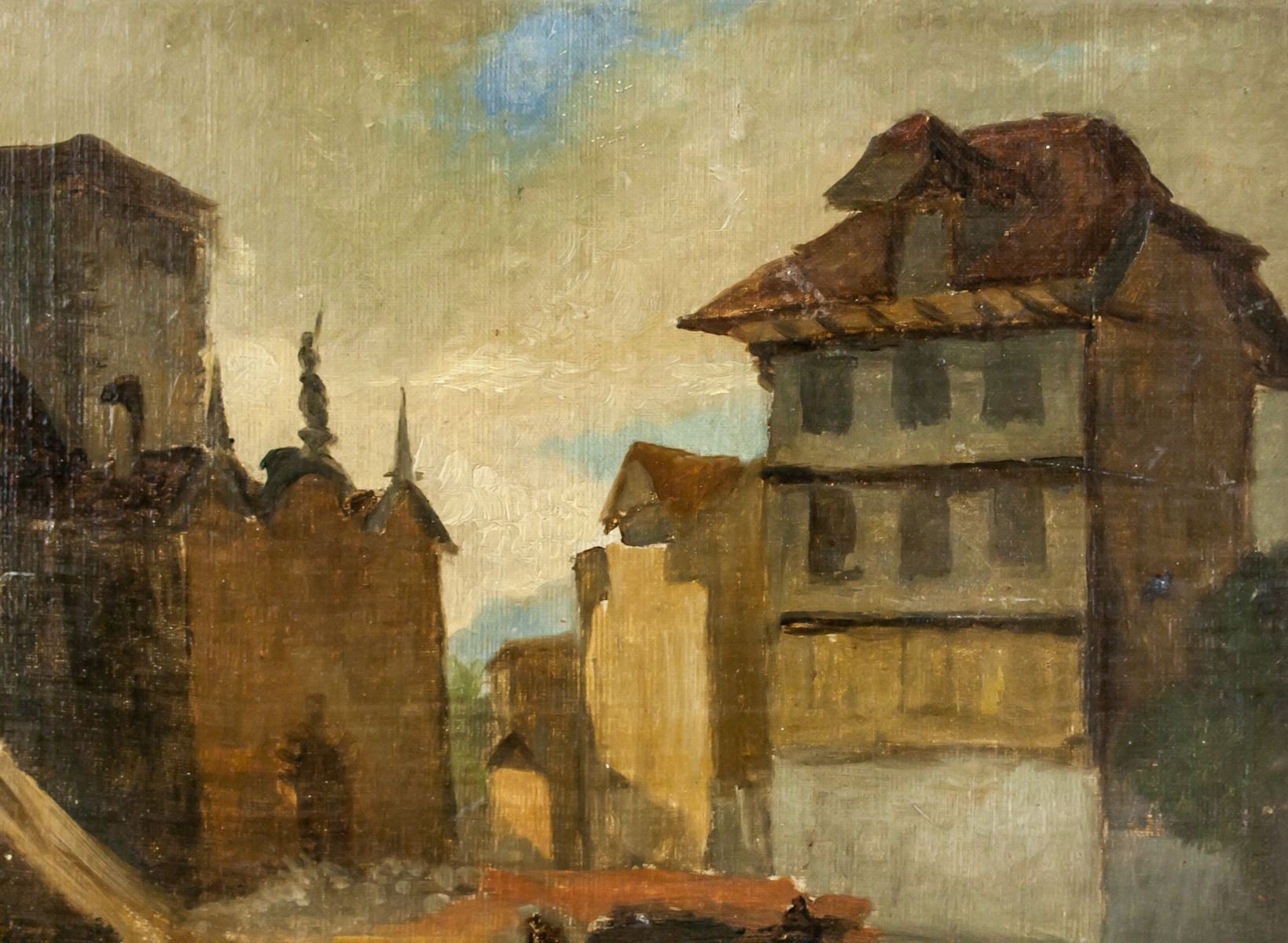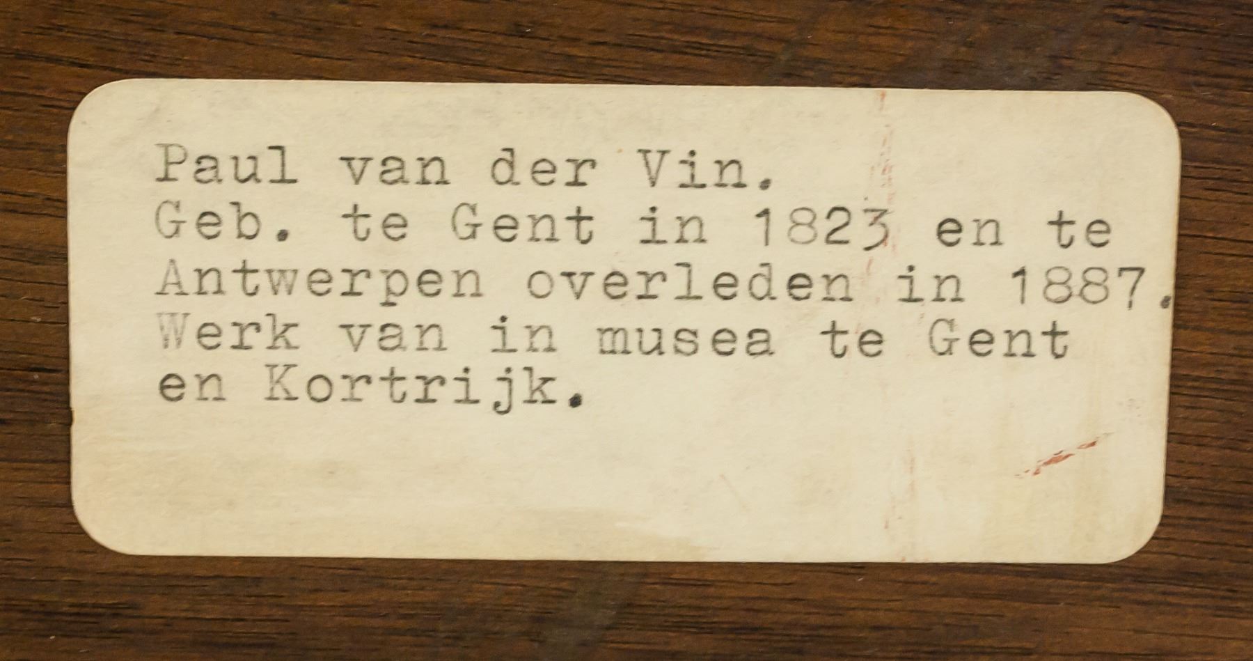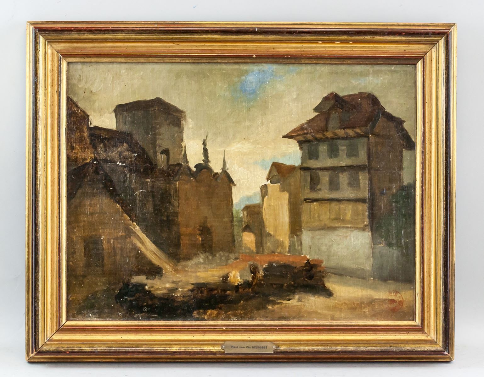 Oil on canvas, framed. Featuring town scene. With gallery stamp on the lower right corner. With name tag lettering Paul van Vin 1823-1887 on bottom of frame. Verso with note lettering Paul van der Vin. Geb. te Gent in 1823 en te Antwerpen overleden in 1887. Werk van in musea te gent en Kortrijk. Attributed to Paul van der Vin (1823-1887, Belgian). 19th Century. 31 x 42 cm. Framed: 41 x 52 cm