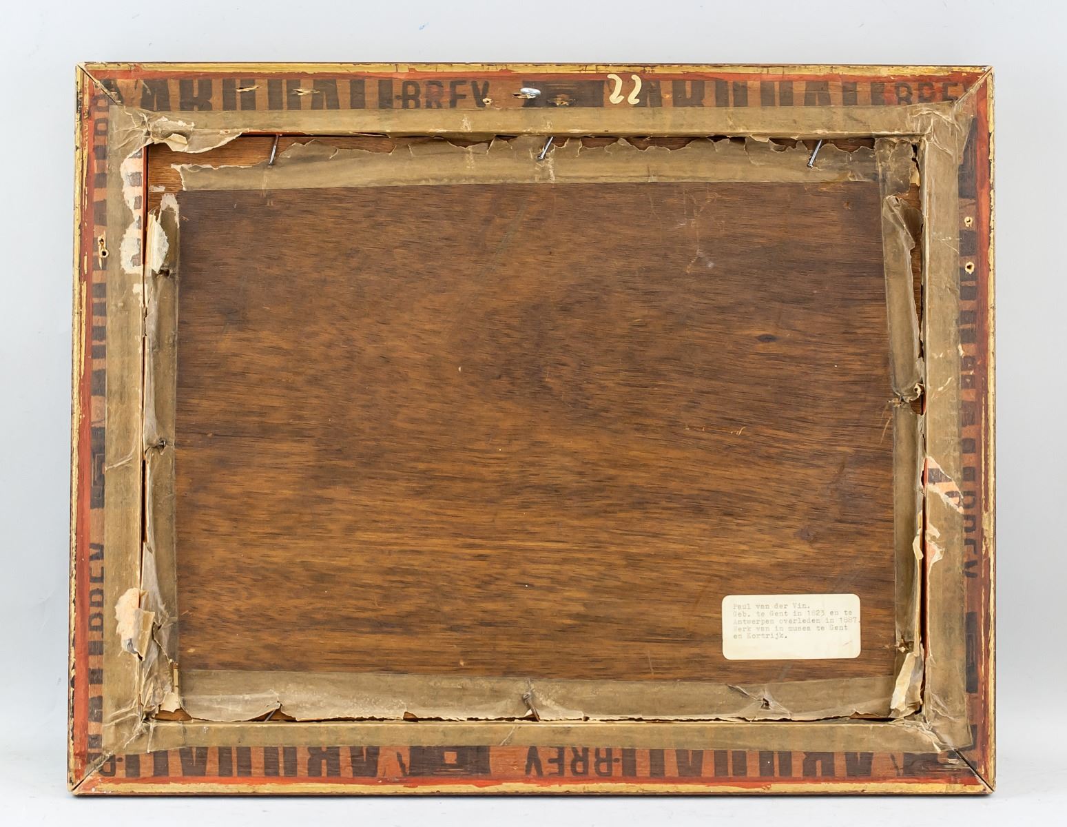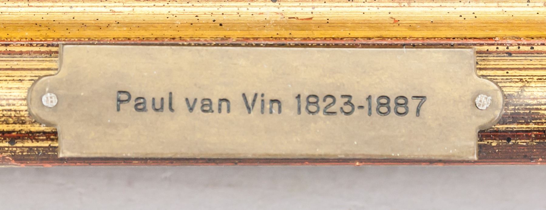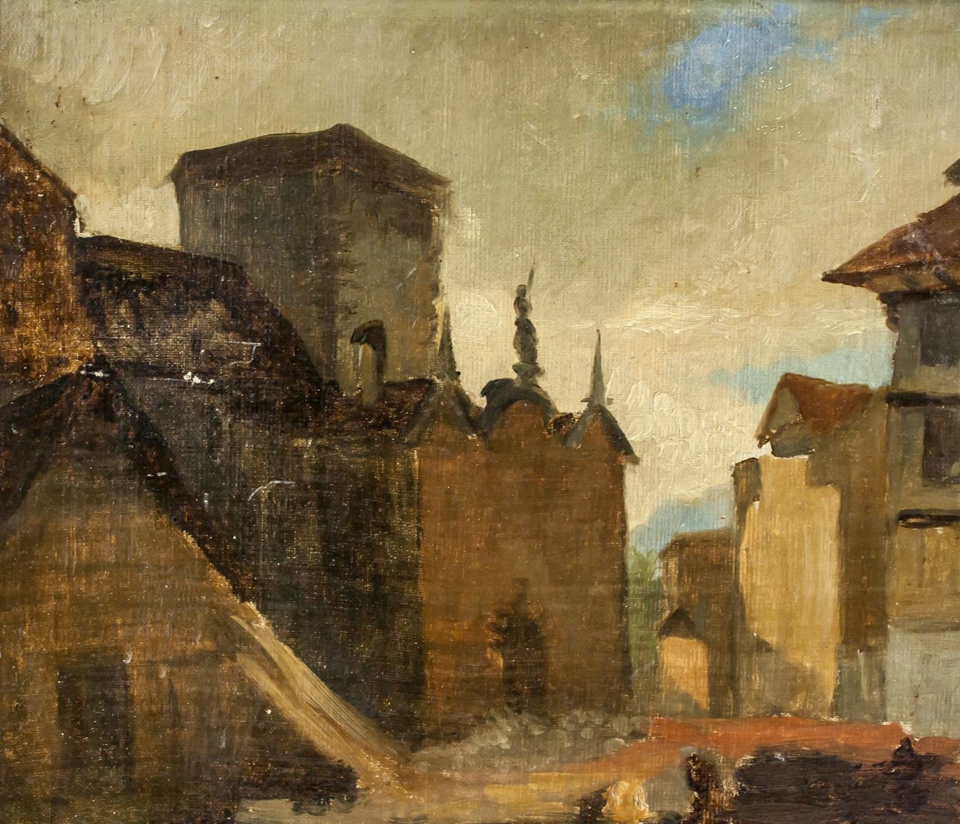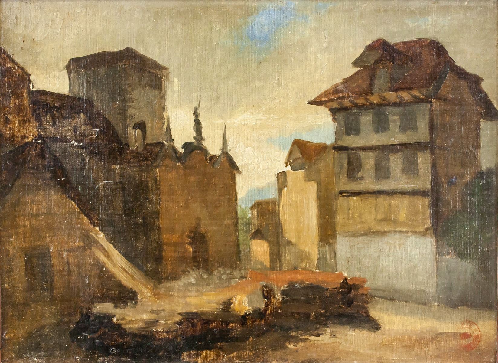 Oil on canvas, framed. Featuring town scene. With gallery stamp on the lower right corner. With name tag lettering Paul van Vin 1823-1887 on bottom of frame. Verso with note lettering Paul van der Vin. Geb. te Gent in 1823 en te Antwerpen overleden in 1887. Werk van in musea te gent en Kortrijk. Attributed to Paul van der Vin (1823-1887, Belgian). 19th Century. 31 x 42 cm. Framed: 41 x 52 cm