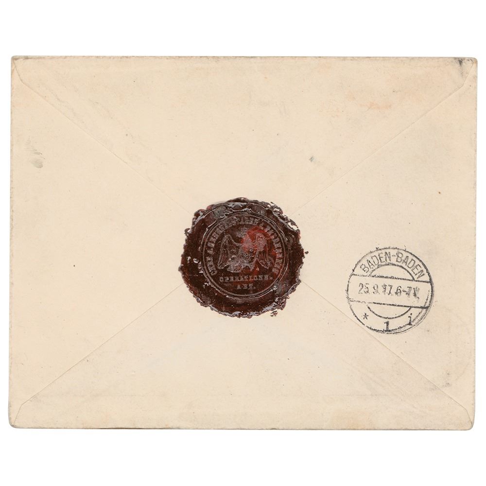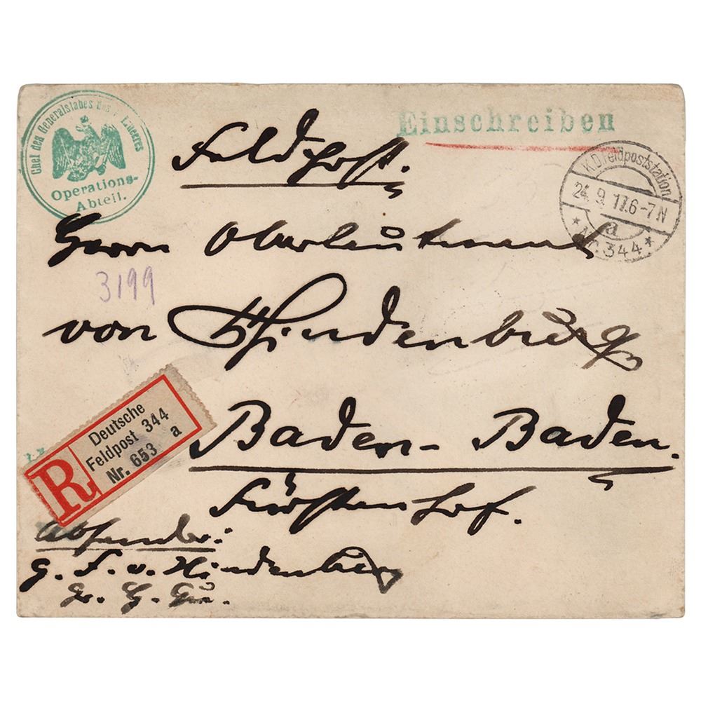 German World War I military hero (1847–1934) and president of Germany from 1925 to 1934. Mailing envelope hand-addressed by Paul von Hindenburg, 6 x 5, addressed to his wife from the front lines of World War I and incorporating his surname, "von Hindenburg," within the Baden-Baden address. Reverse retains the impressive black wax seal. The philatelically important piece boasts an affixed "Deutsche Feldpost 344" stamp and multiple postmarks. In fine condition.