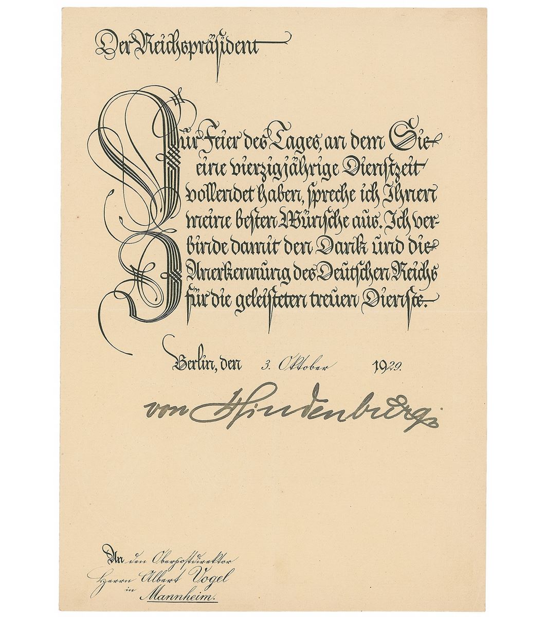 Partly-printed DS in German, signed “von Hindenburg,” one page, 8.25 x 11.5, October 3, 1929. Untranslated document prominently signed at the conclusion in bold ink and blindstamped with an official seal to the lower left. In fine condition, with central vertical and horizontal folds (the vertical fold passing through a single letter of the signature).