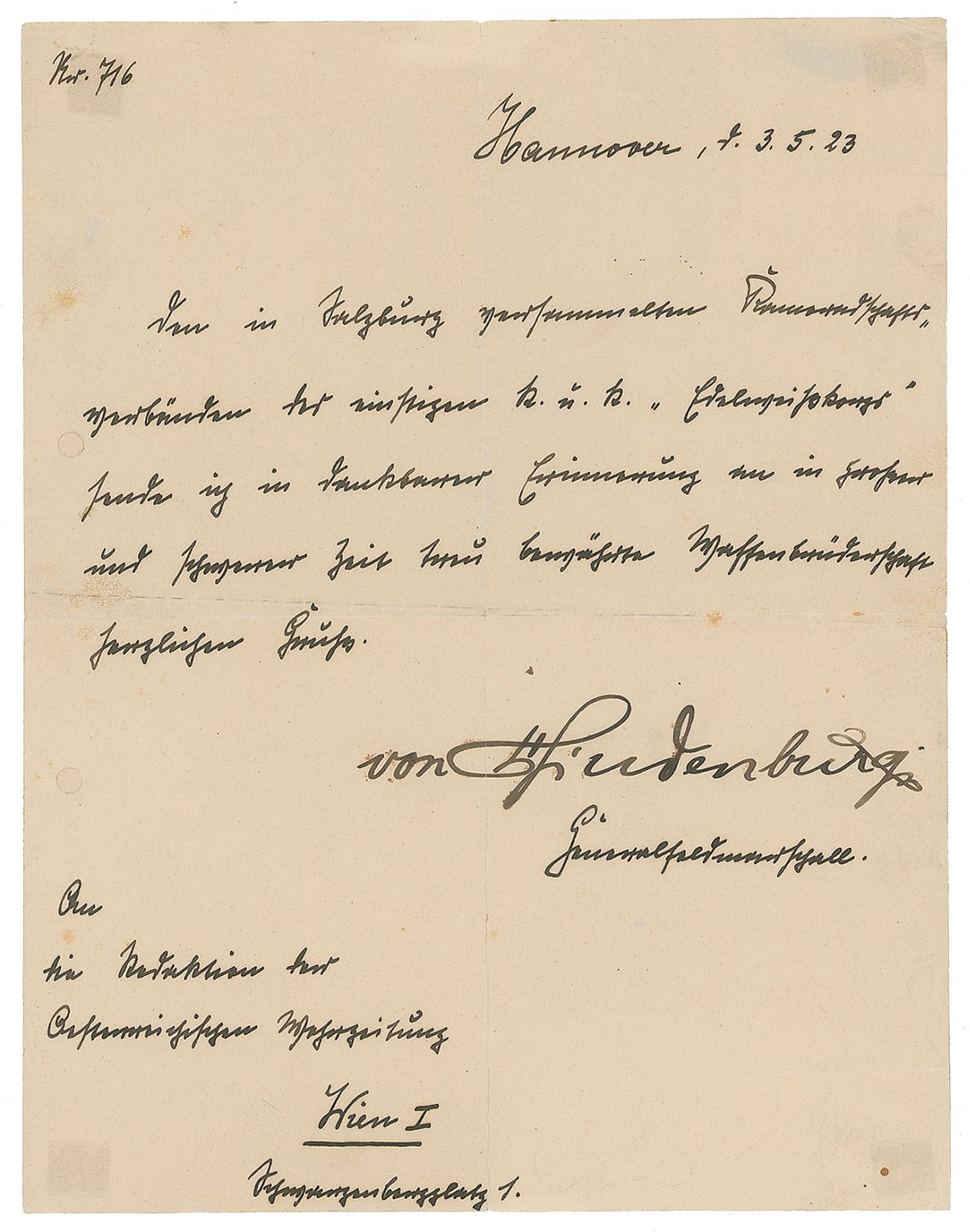 Untranslated LS in German, signed “von Hindenburg,” one page, 8.75 x 11.25, May 3, 1923. In very good to fine condition, with light show-through at the corners from old tape on the back, and two repaired file holes to the left edge.