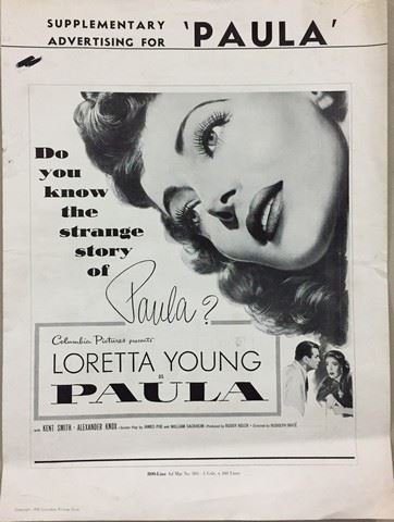 Paula (Universal Pictures, 1952). An extremely rare and oversized Publicity Press Book. Starring: Loretta Young. The book has fold lines, creases, marks, edge wear damage and paper loss. Very Fine. (11" X 17").